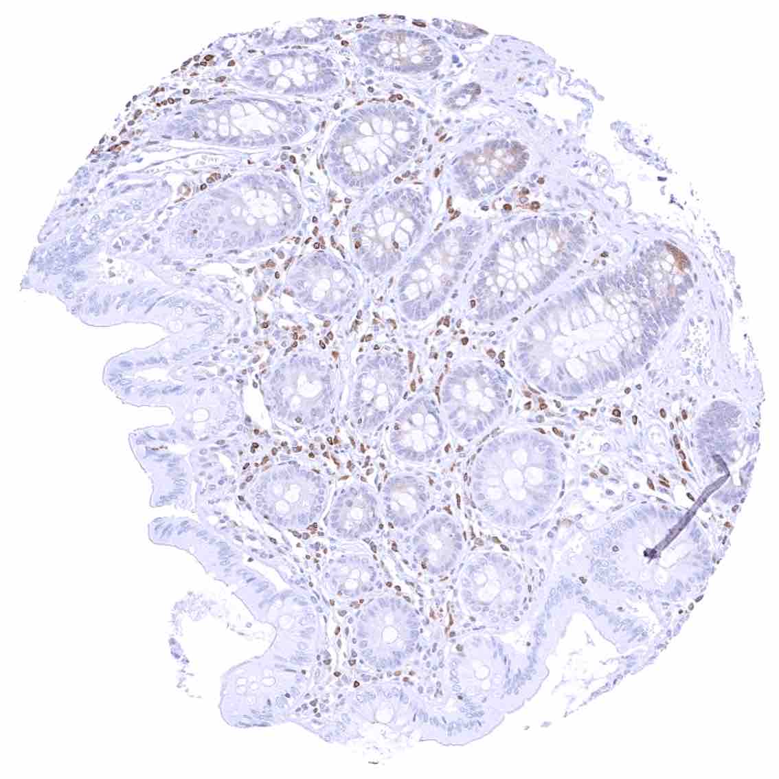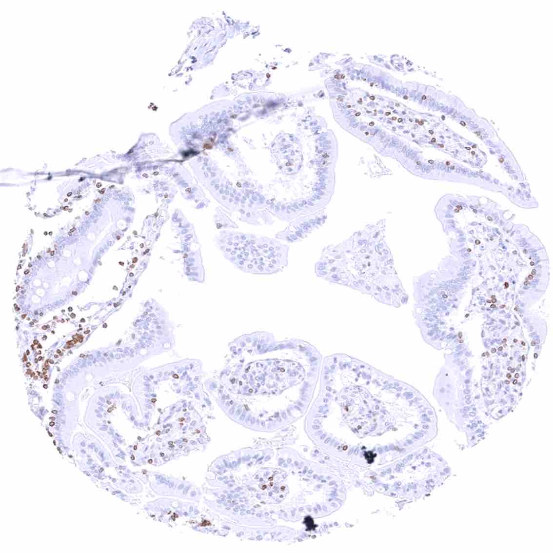 Duodenum, mucosa – Cytoplasmic bcl-2 staining is largely limited to lymphocytes. The epithelium is mostly negative, but a weak staining occurs in some crypt cells.