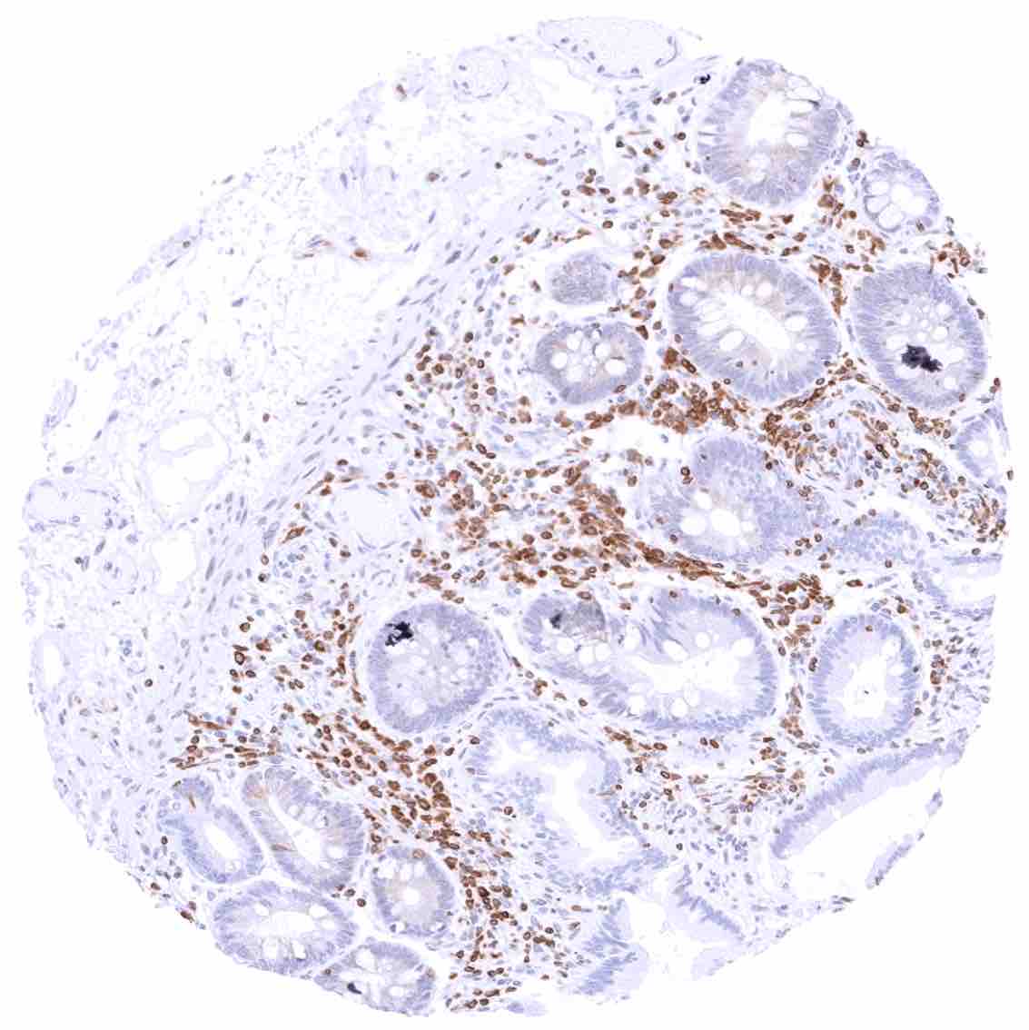 Ileum, mucosa – Cytoplasmic bcl-2 staining is limited to lymphocytes.