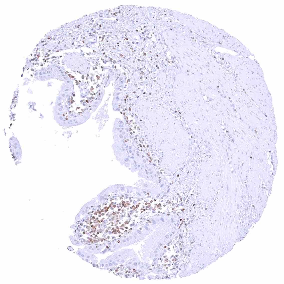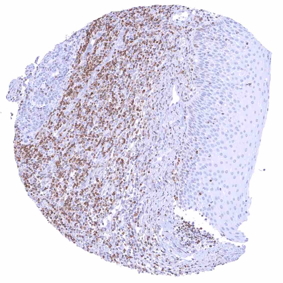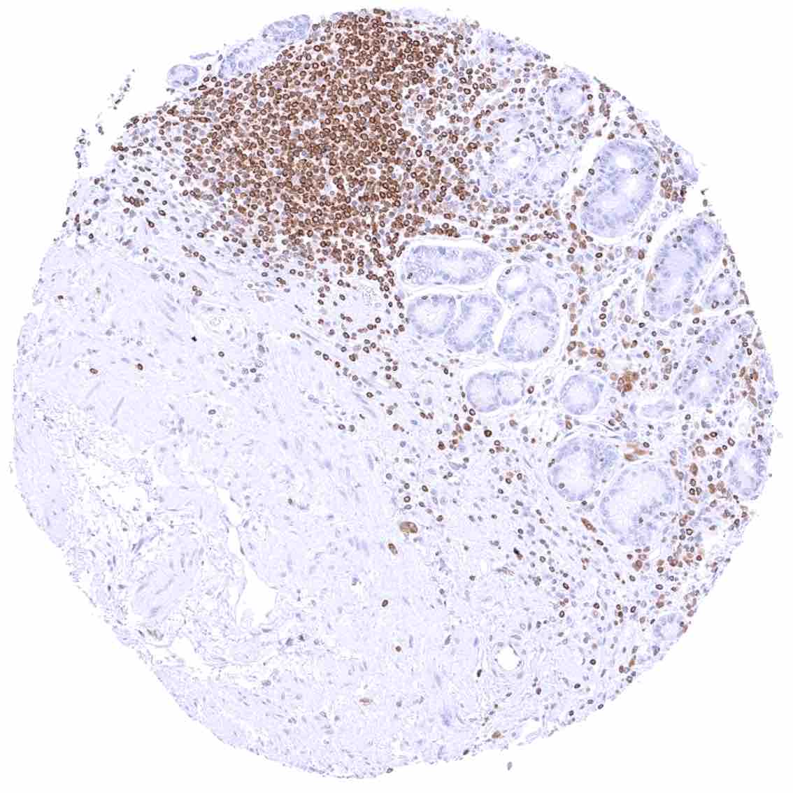 Stomach, antrum – The epithelium is bcl-2 negative. Bcl-2 staining is limited to lymphocytes. .jpeg