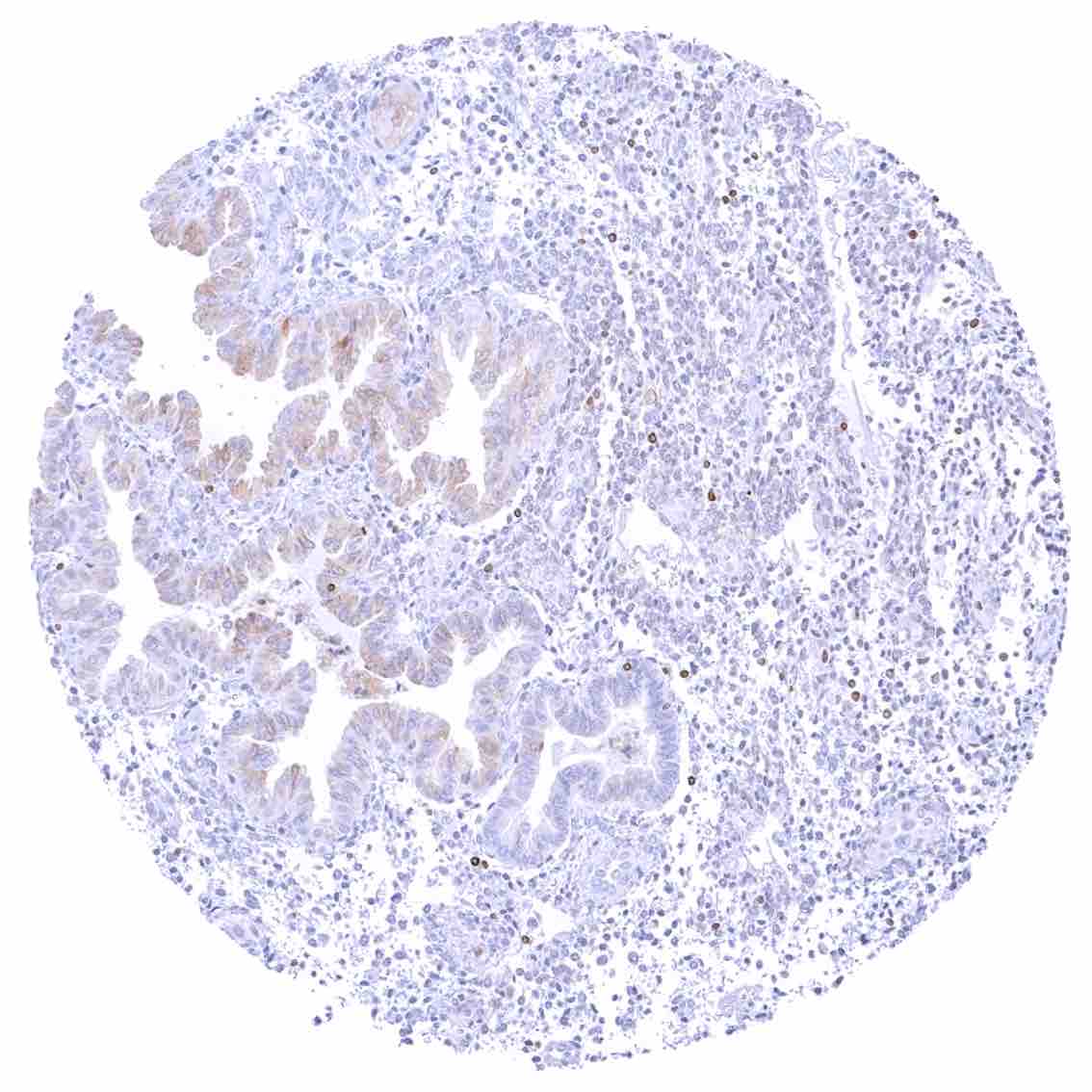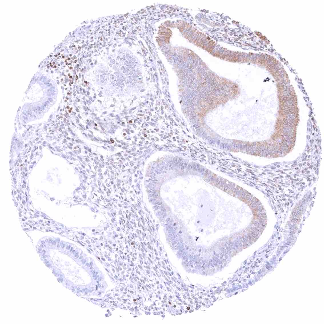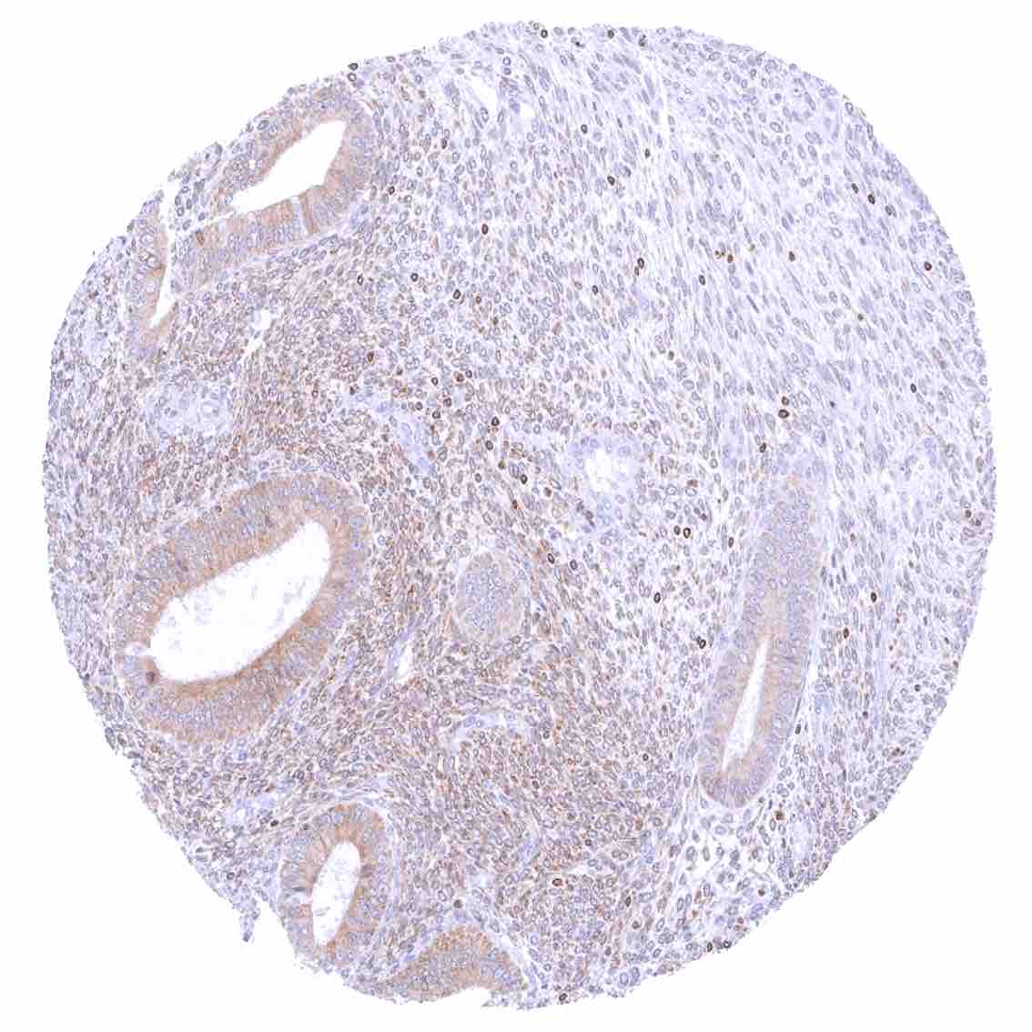 Uterus, endometrium (proliferation) – Weak to moderate cytoplasmic bcl-2 staining of epithelial and stromal cells.