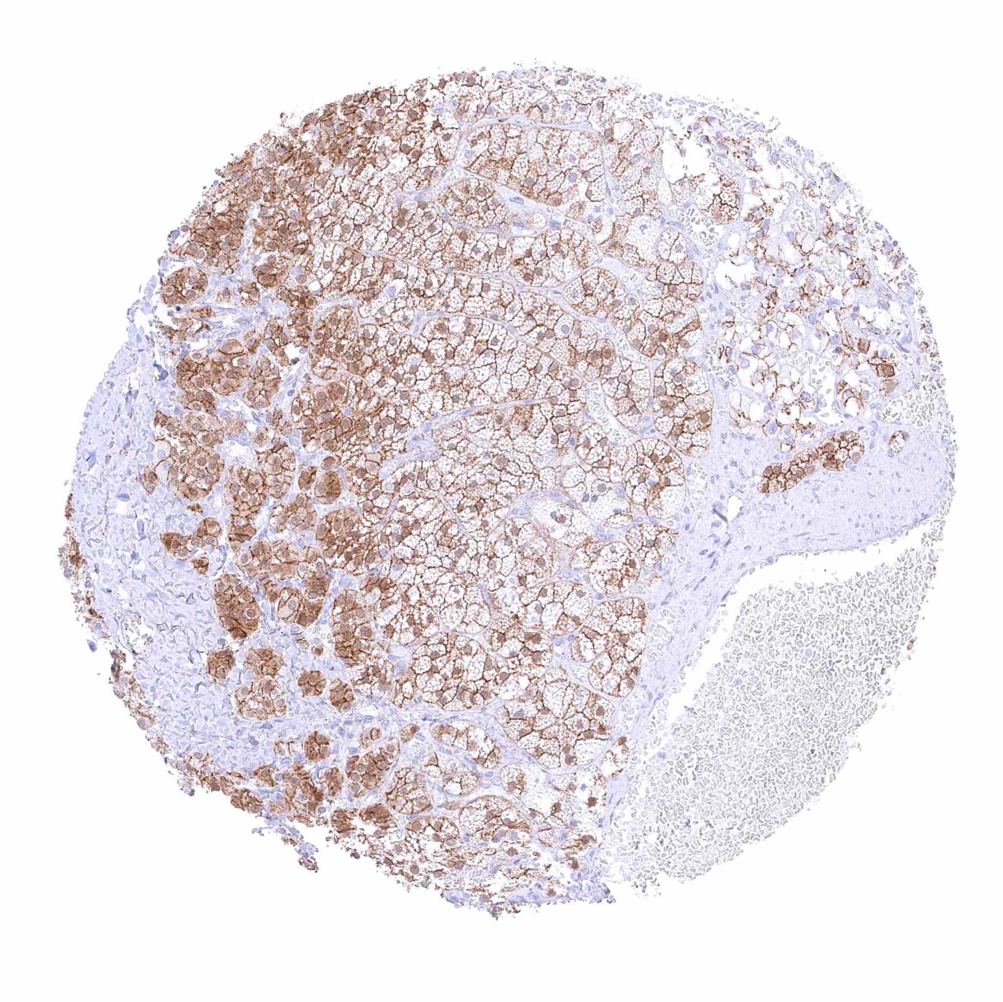 Adrenal gland – Moderate membranous beta catenin staining of adrenocortical cells, in a fraction of cells accompanied by a nuclear and cytoplasmic positivity.