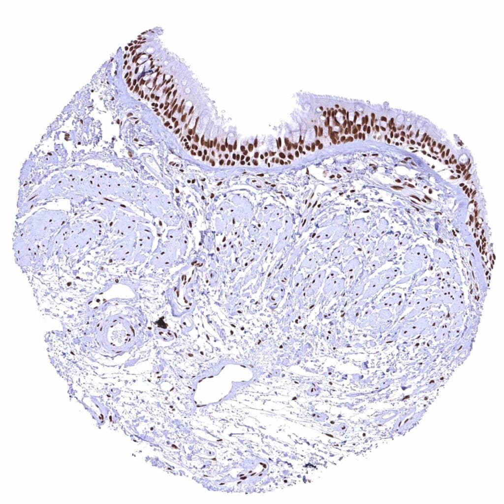 Urinary bladder, urothelium – Distinct nuclear BRD4 staining of urothelial cells.