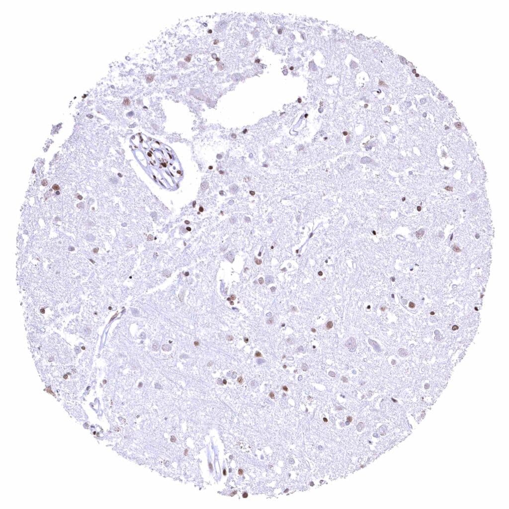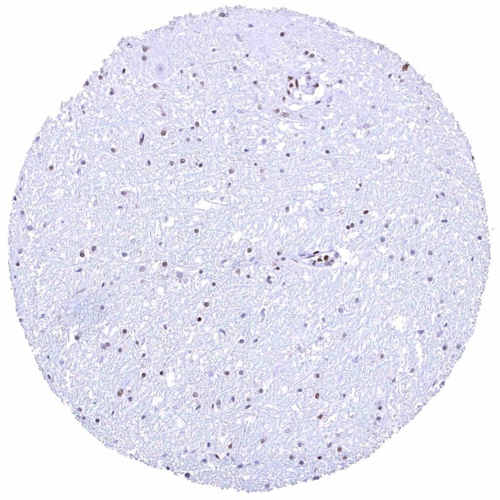 Cerebrum, grey matter – BRD4 staining is strong in glia cells but low or absent in neuronal cells.
