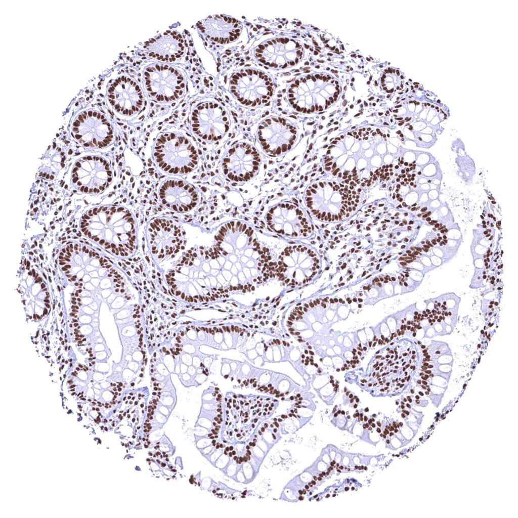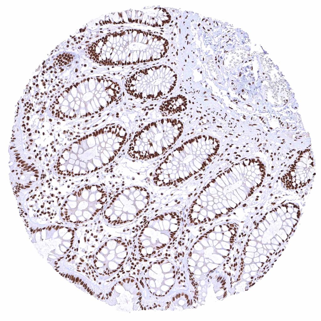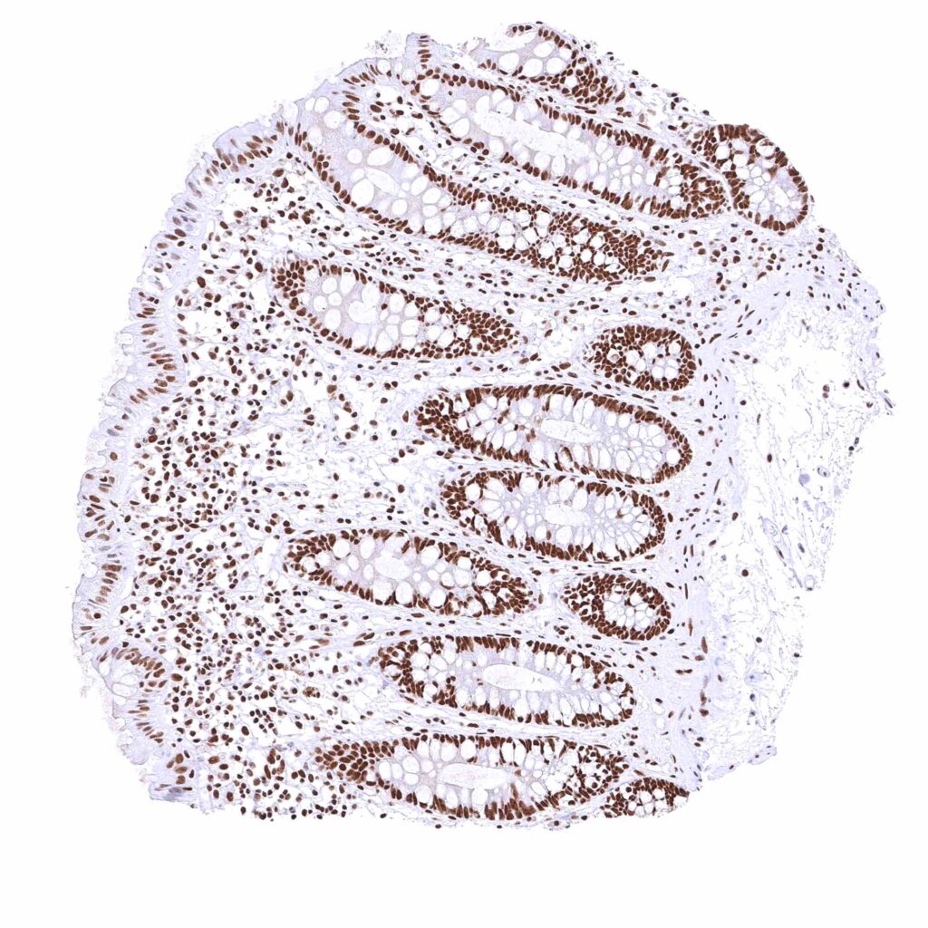 Colon descendens, mucosa – Nuclear BRD4 staining of surface epithelial cells is weaker than in crypts.