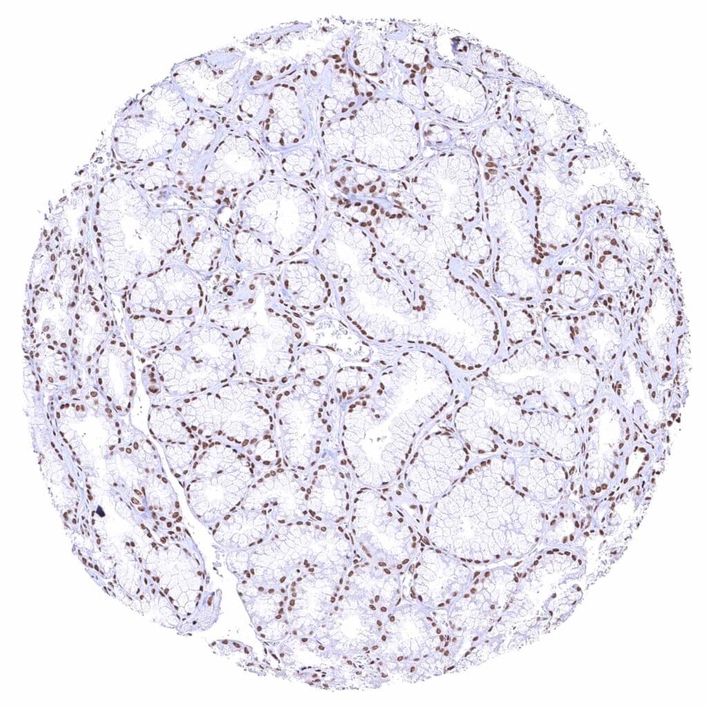 Stomach, antrum – BRD4 staining of surface epithelial cells is slightly more intense than in glandular cells.