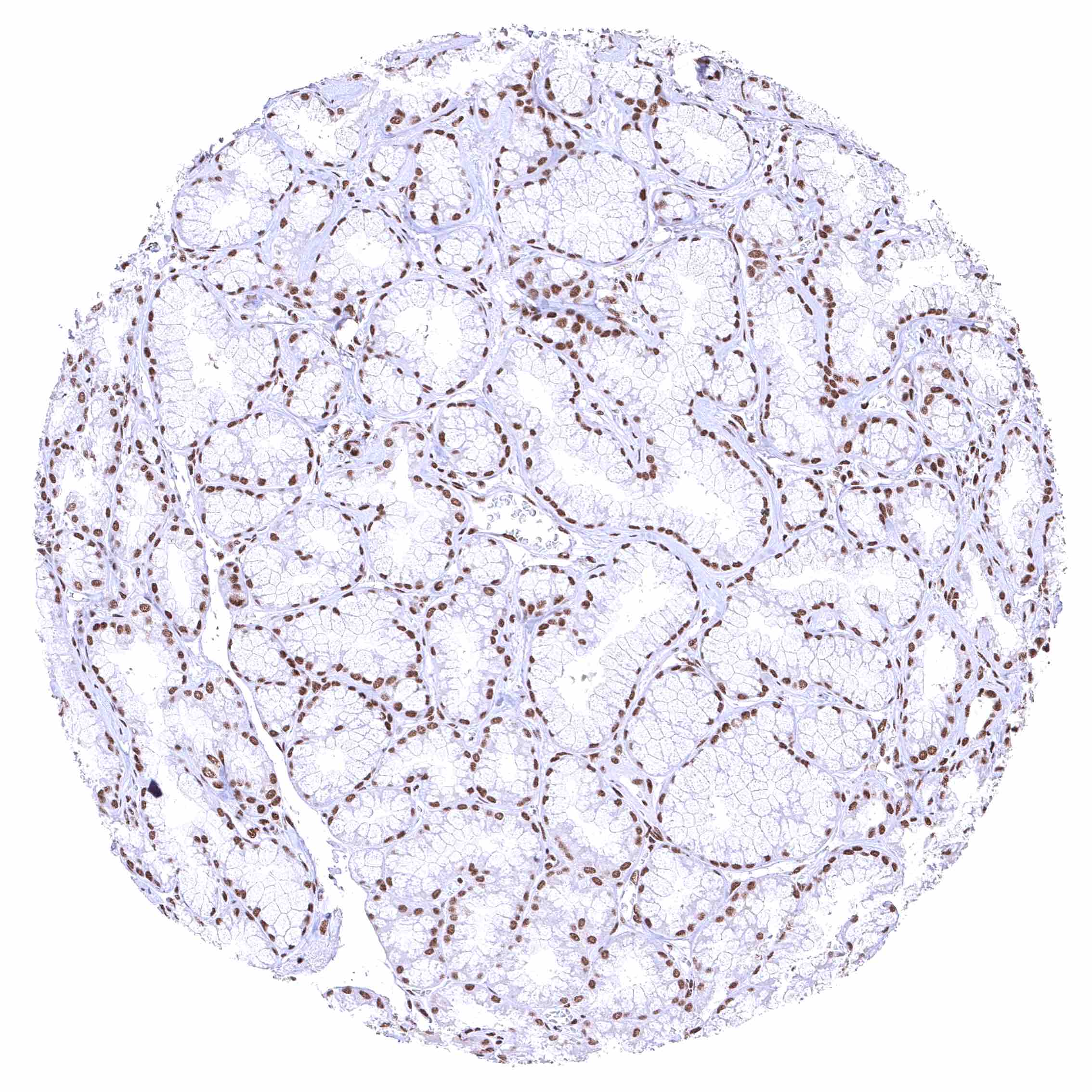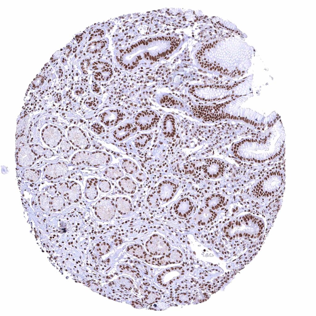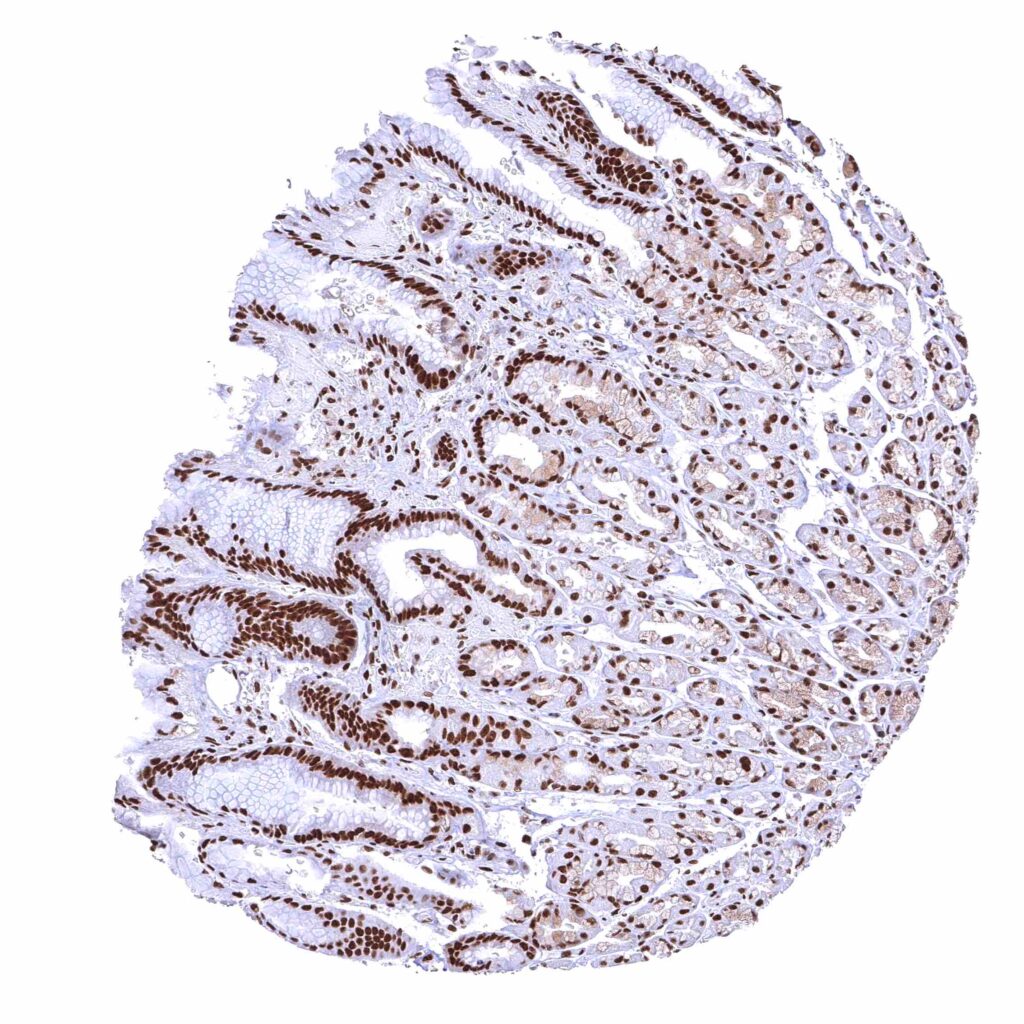 Stomach, corpus – BRD4 staining of surface epithelial cells is slightly more intense than in glandular cells.