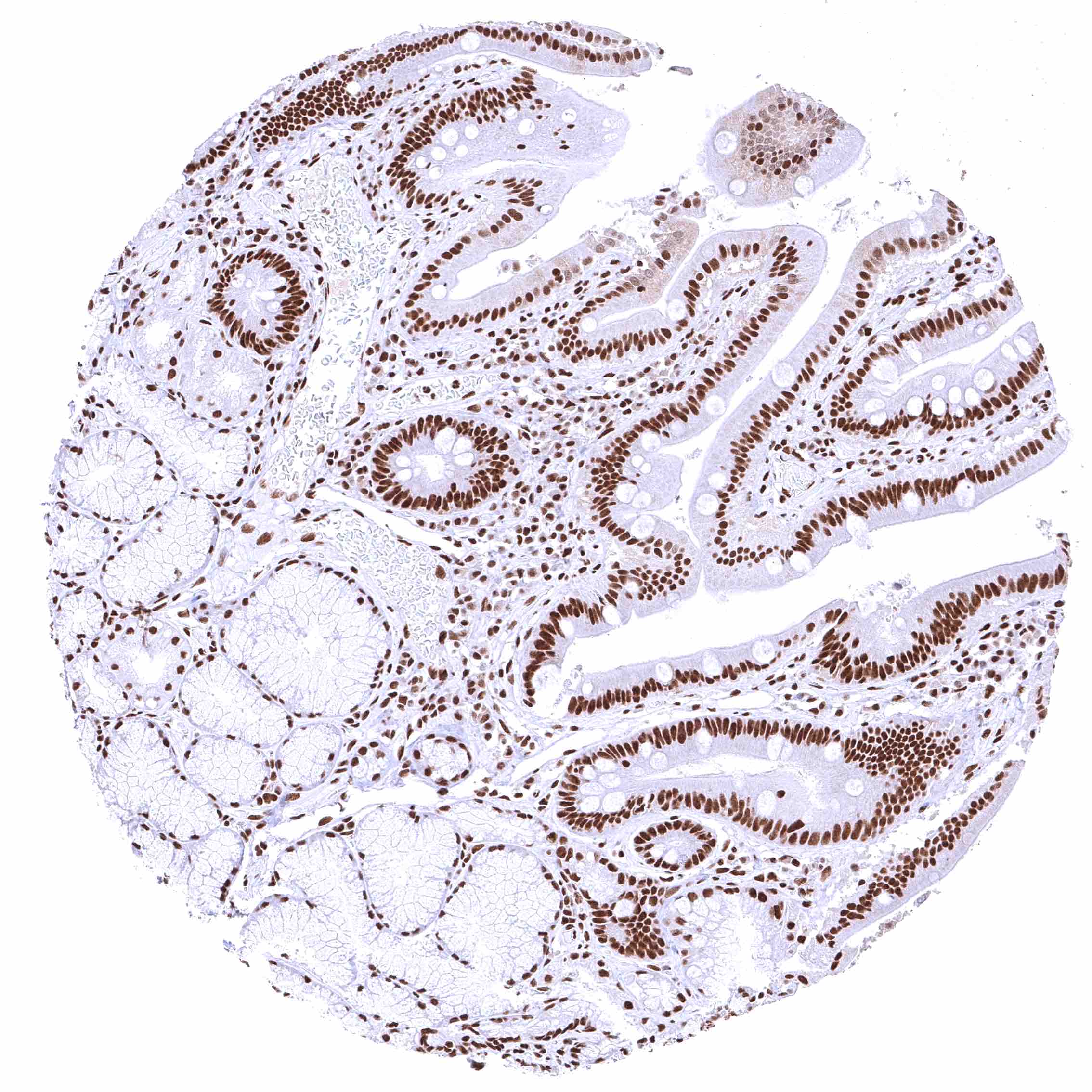 Duodenum, mucosa – BRD4 staining of surface epithelial cells is markedly stronger than in Brunner glands.