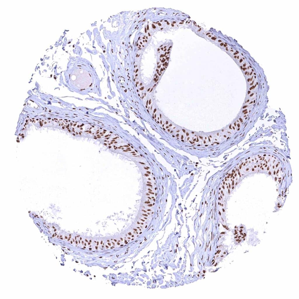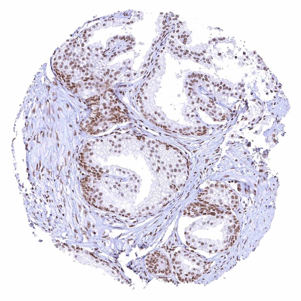 Prostate – BRD4 staining of basal cells is somewhat stronger than of acinar cells.