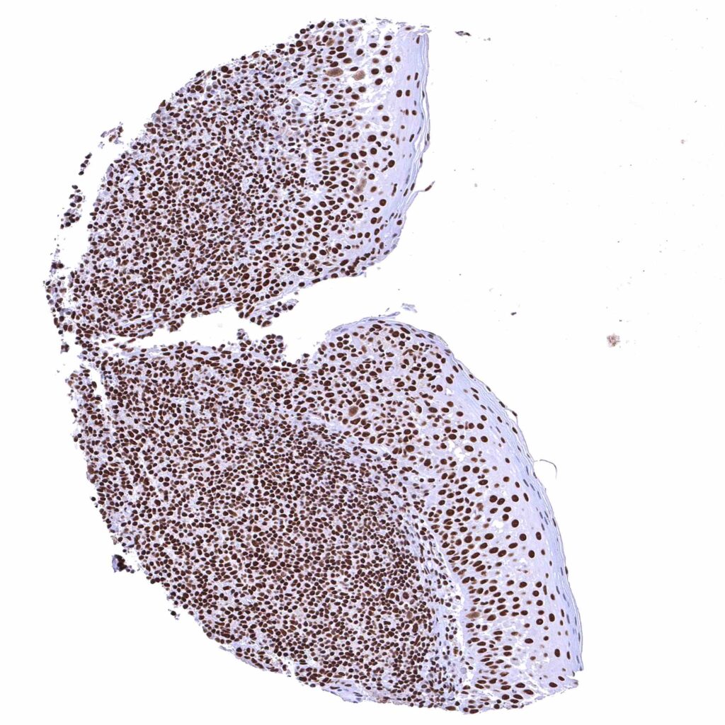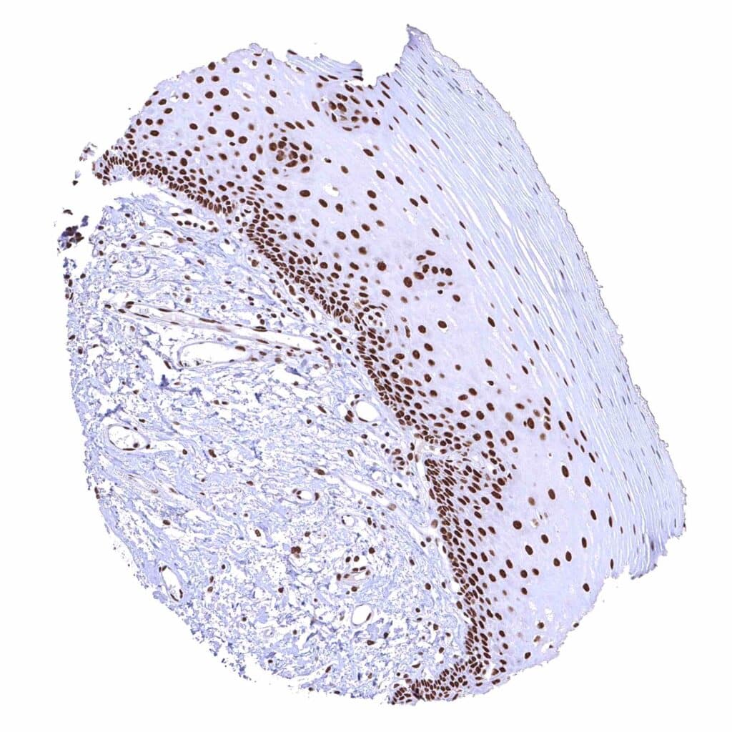 Esophagus, squamous epithelium – Distinct nuclear BRD4 staining of squamous epithelial cells with a slight decrease of the staining intensity towards the most superficial cell layers. .jpeg