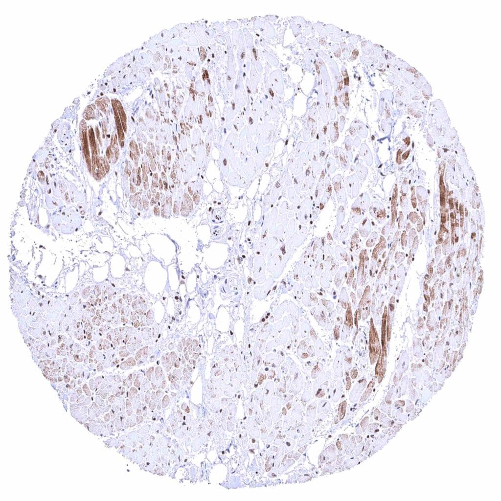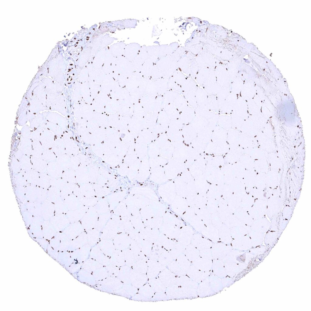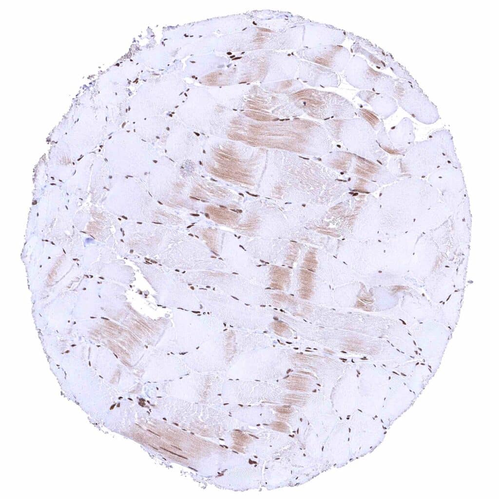 Skeletal muscle – Distinct nuclear BRD4 staining of all cells. A cytoplasmic staining of muscle cells is not seen in this sample.