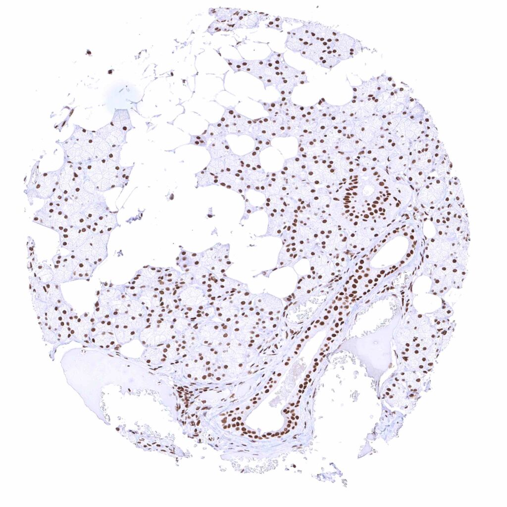 Parotid gland – BRD4 staining of glandular cells is somewhat weaker than of excretory duct cells.