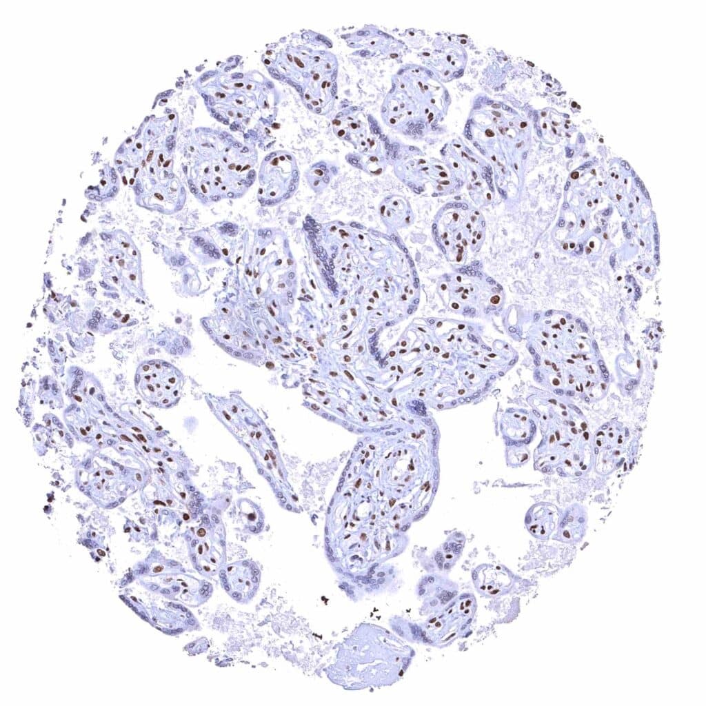 Placenta, early – Nuclear BRD4 staining is particularly strong in all trophoblast cells.