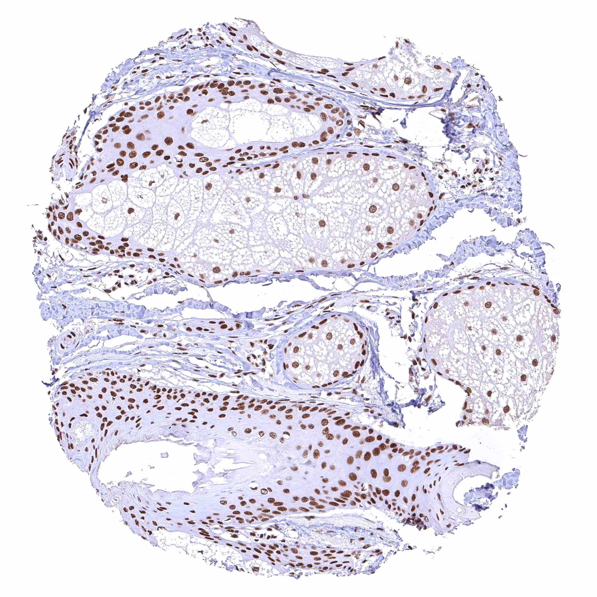 Skin, hairfollicel and sebaceous glands – Moderate to strong BRD4 staining of sebaceous gland cells. Nuclear BRD4 staining is somewhat stronger in associated hair follicles cells.
