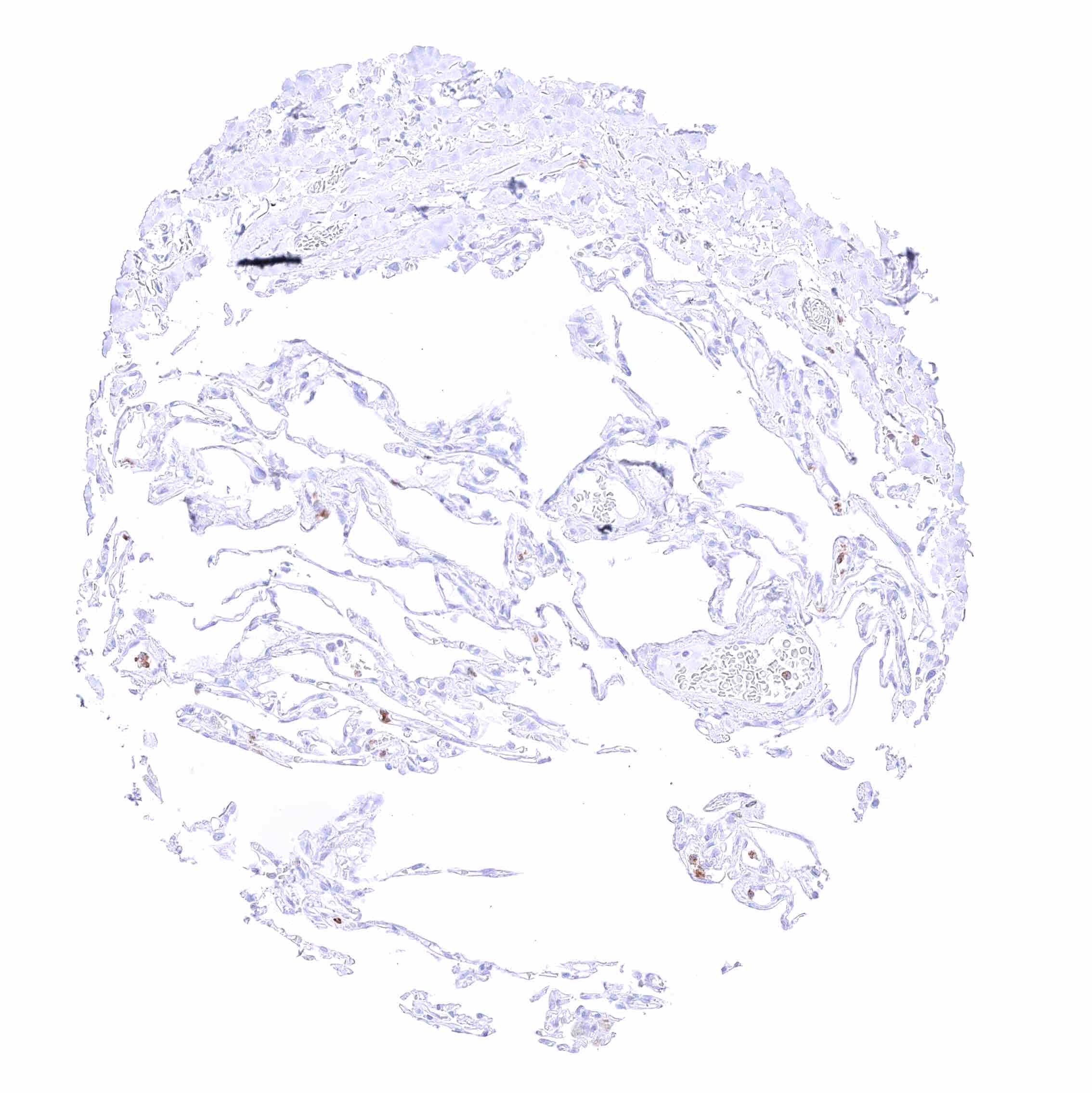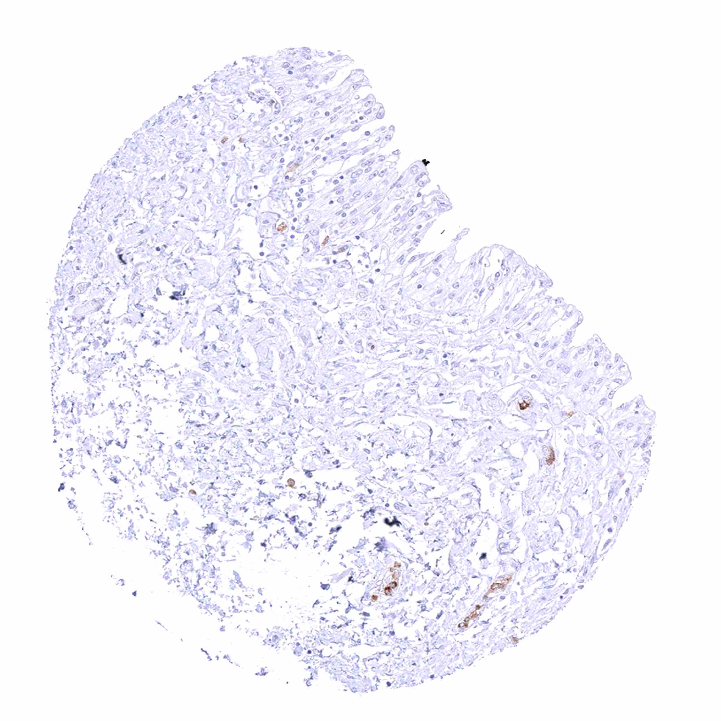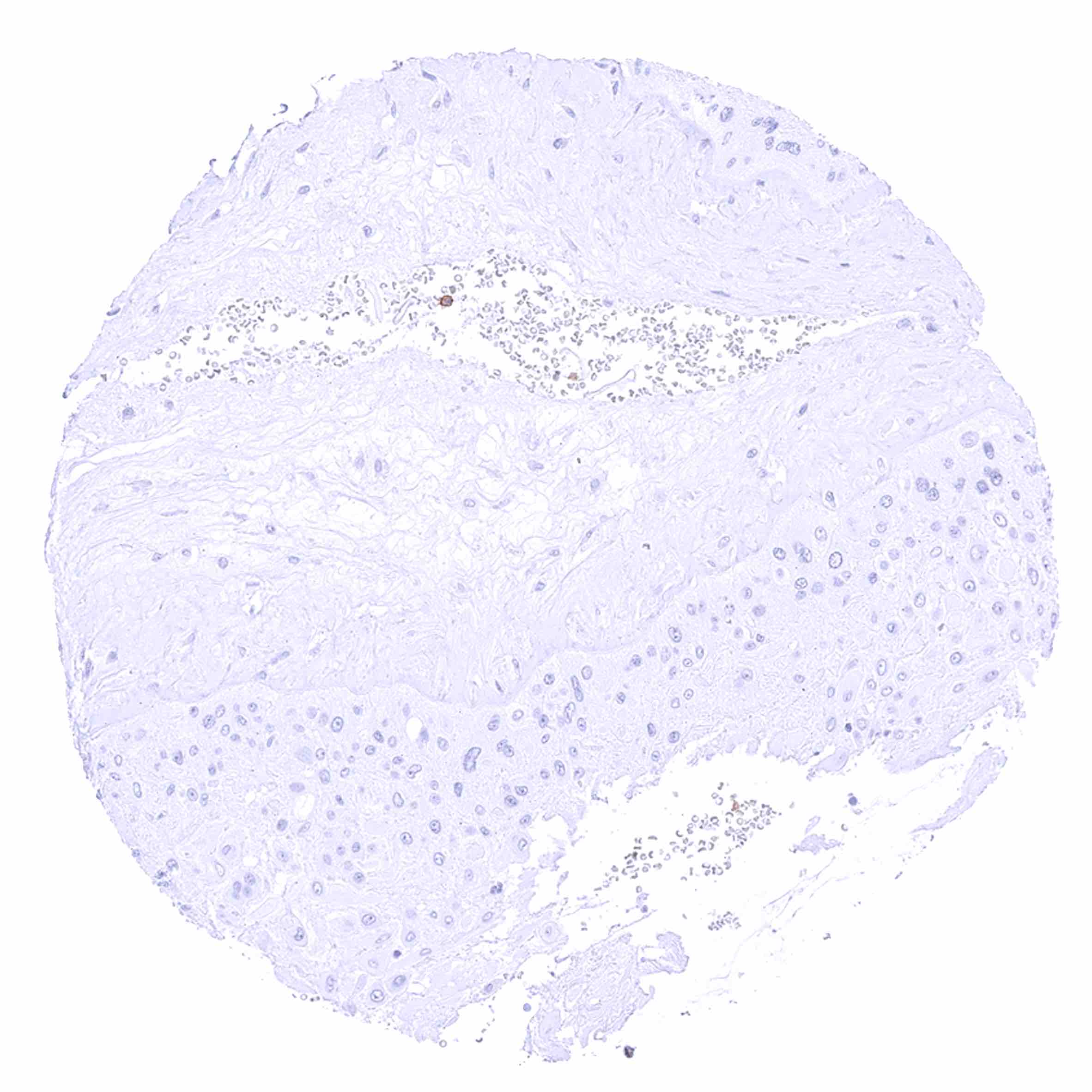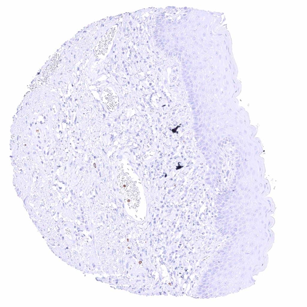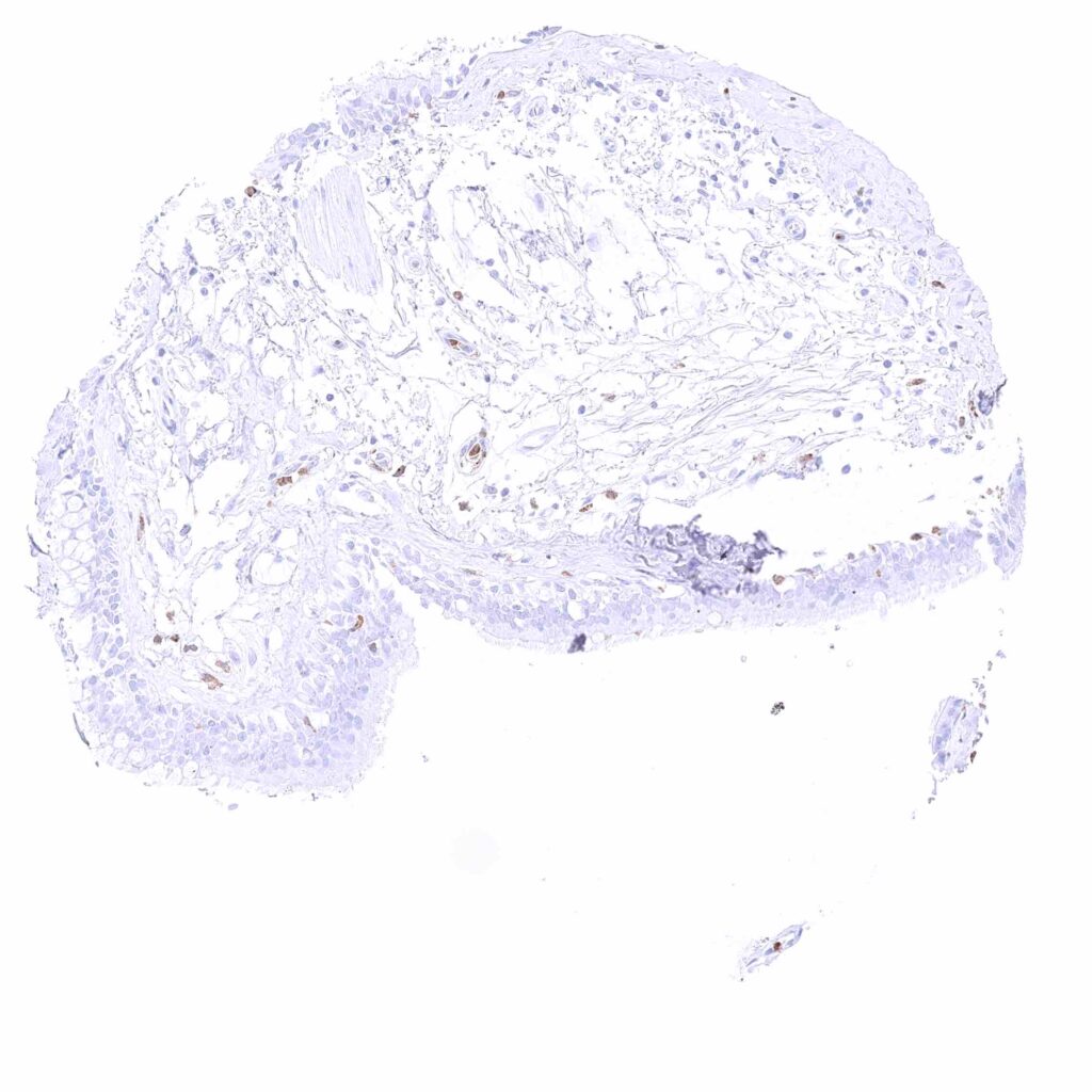 Parotid gland – Weak membranous CD35 staining of erythrocytes in this sample.