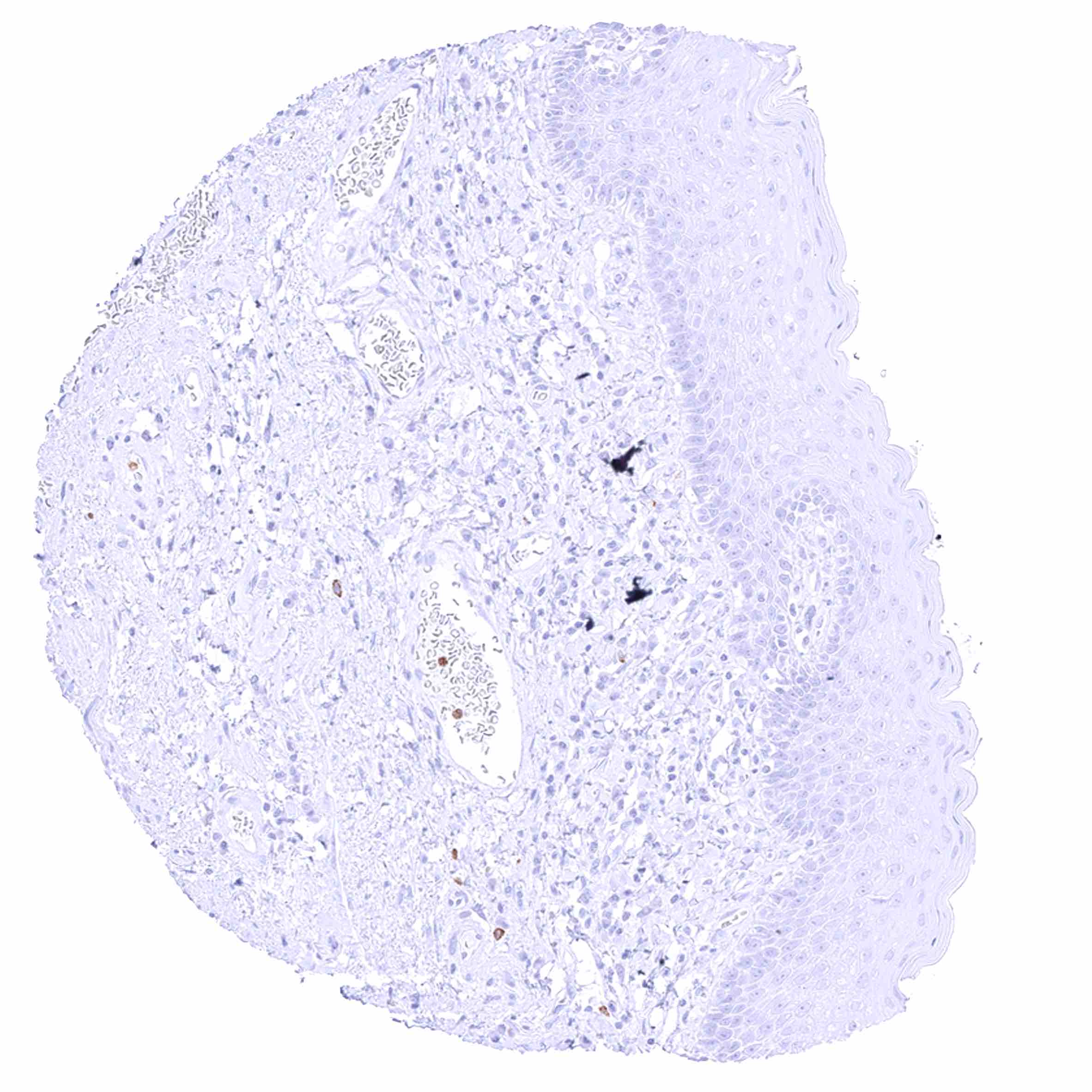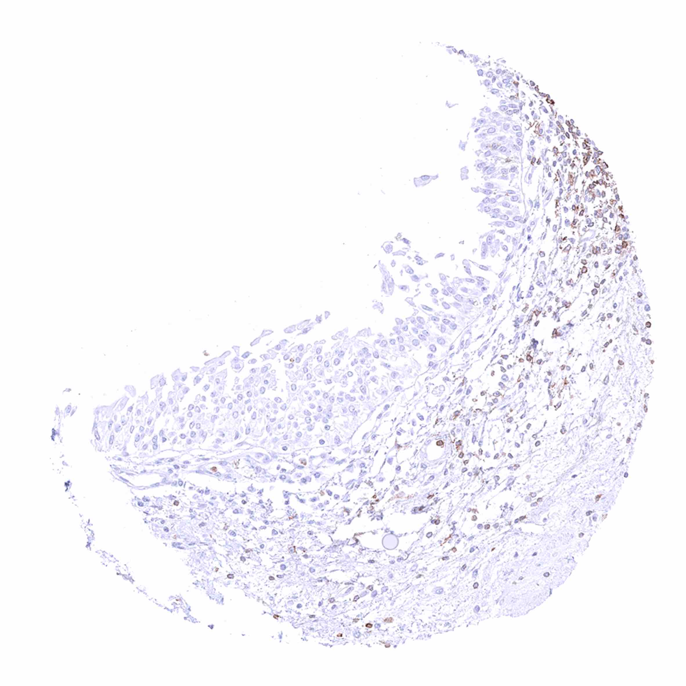Kidney, pelvis, urothelium – Distinct membranous CD35 staining of a large subset of inflammatory cells. The squamous epithelium is CD35 negative.