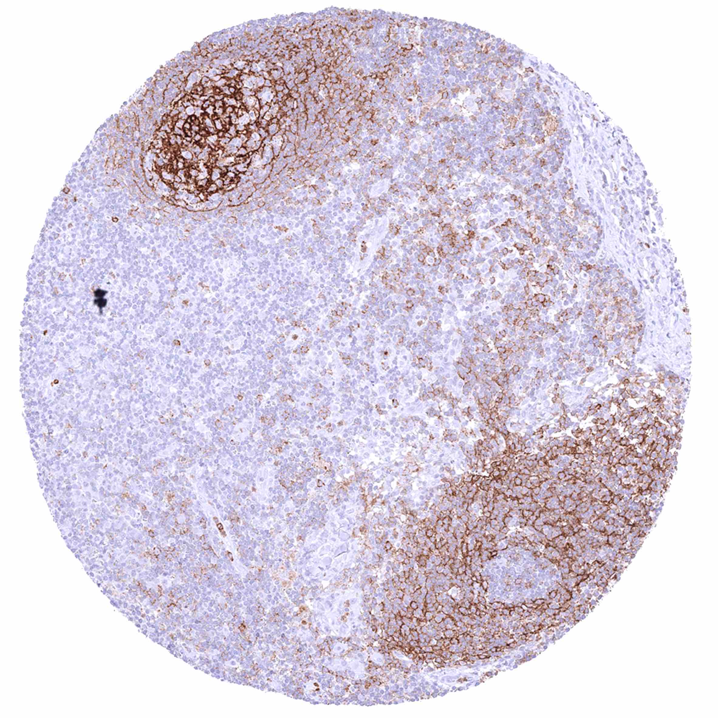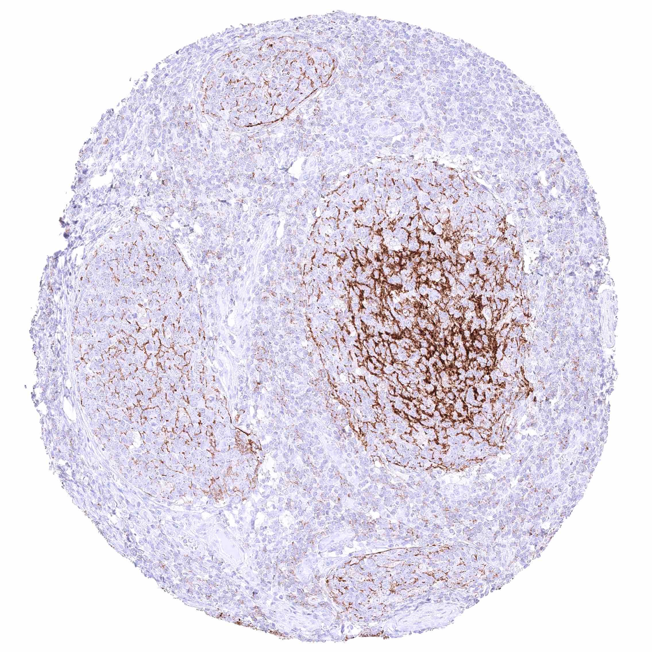 Lymph node – Strong membranous CD35 staining of follicular dendritic cells and of a subset of lymphocytes.
