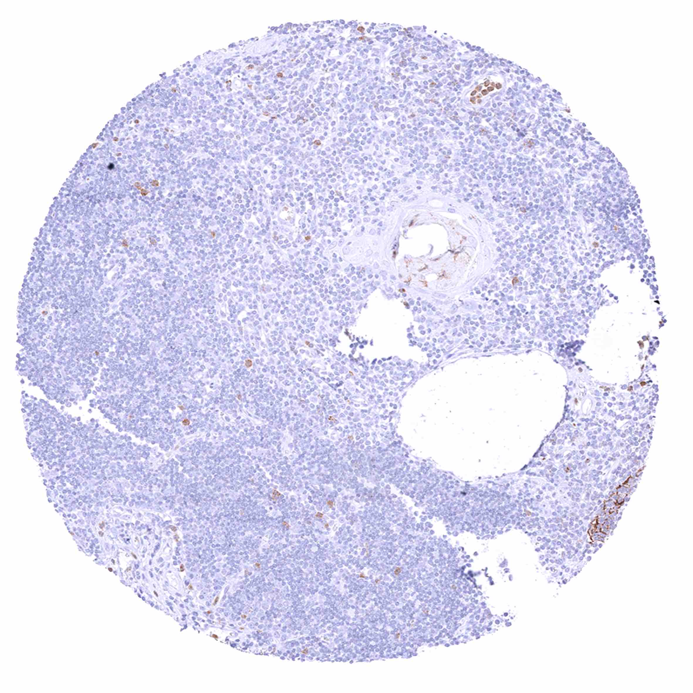 Thymus – Distinct membranous CD35 staining of only few lymphocytes.