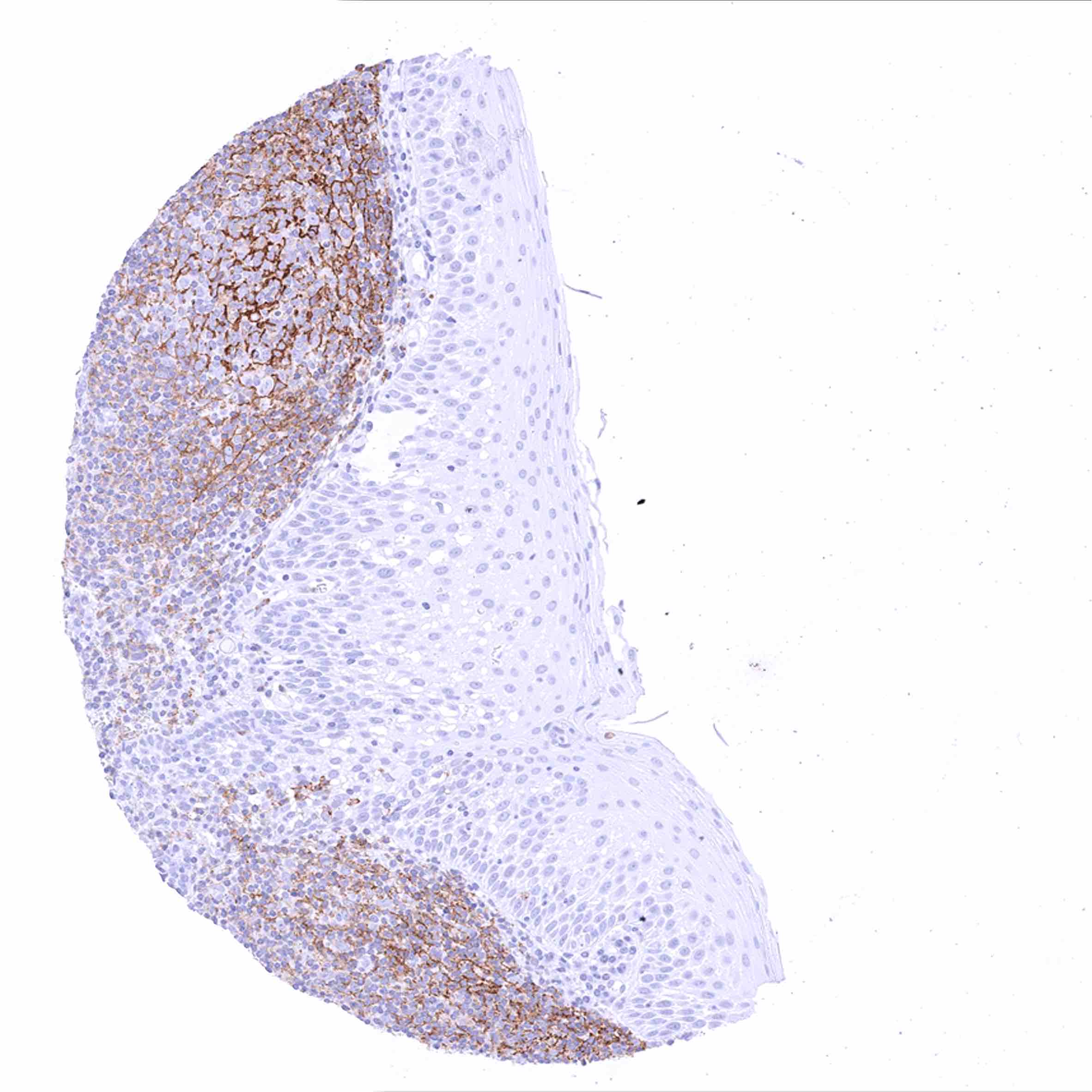 Tonsil, surface epithelium – Strong membranous CD35 staining of follicular dendritic cells and of many lymphocytes. The squamous epithelium is CD35 negative.
