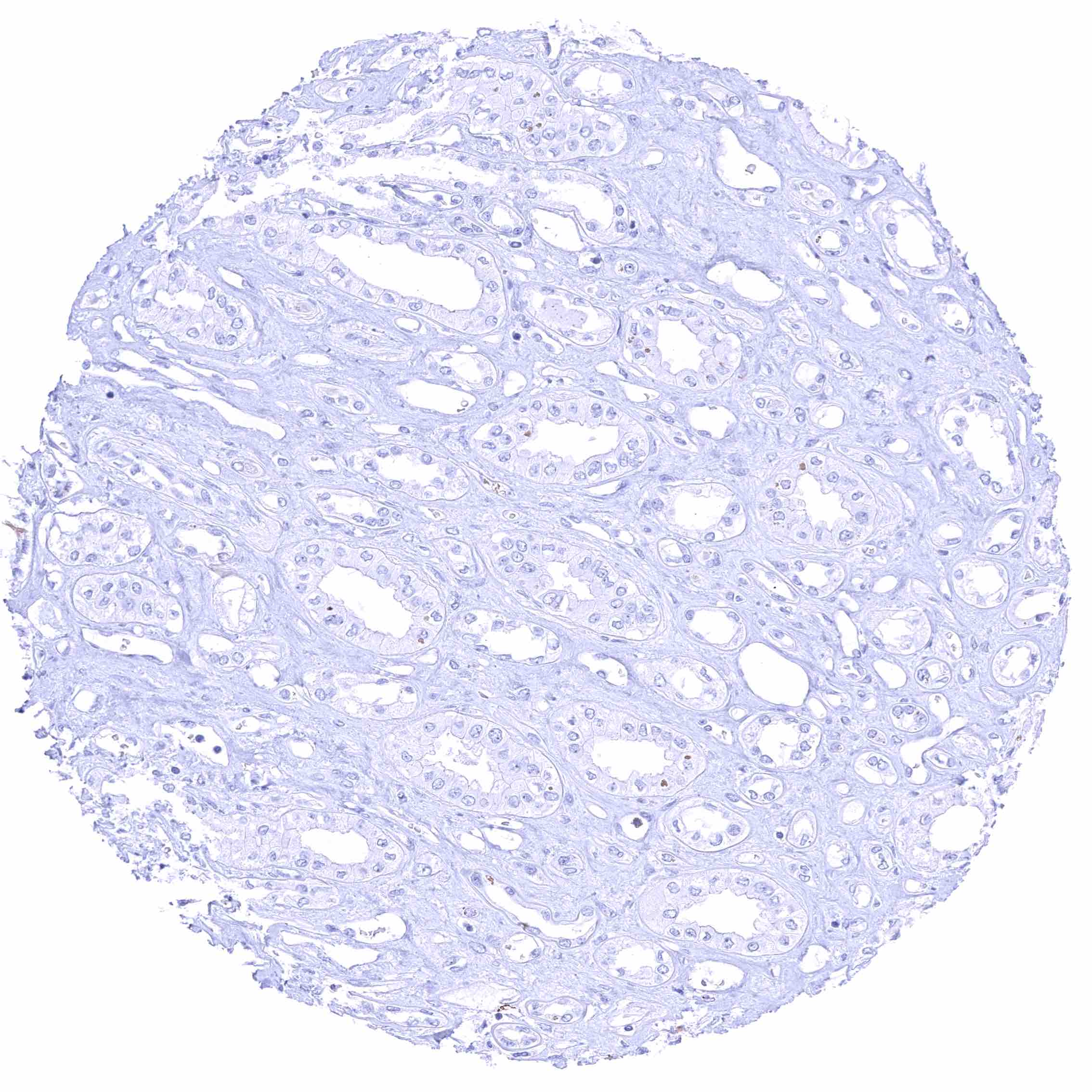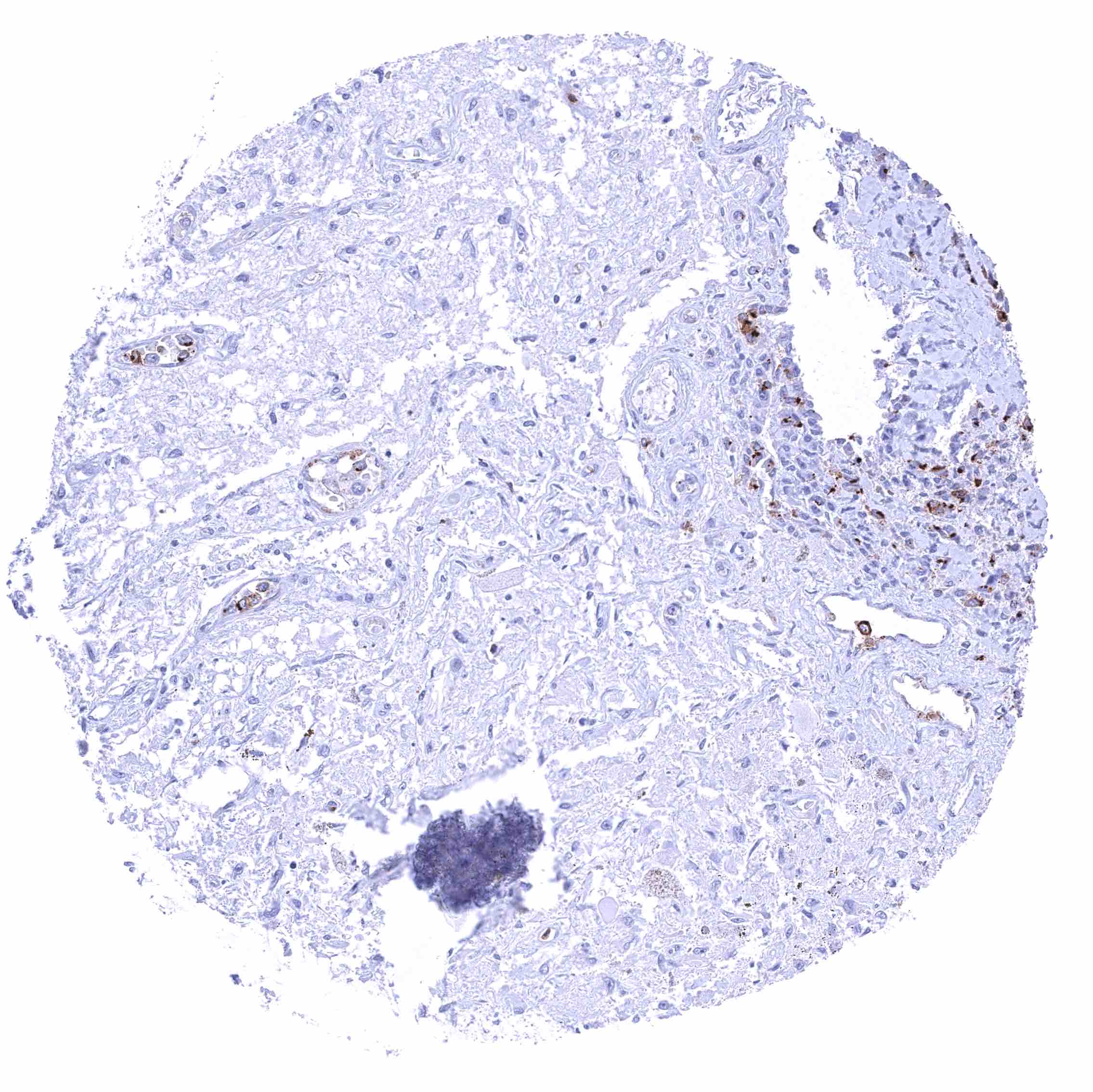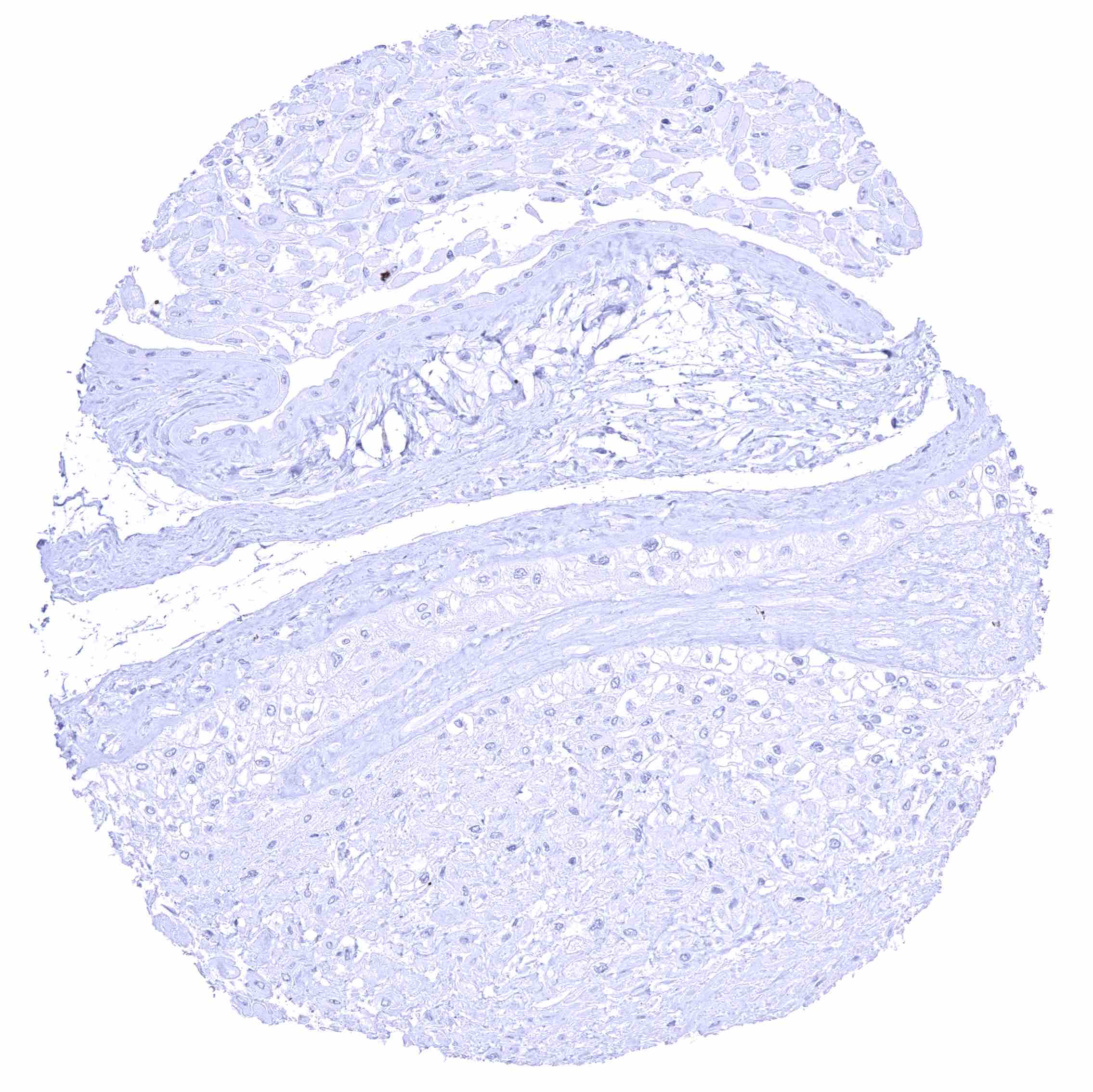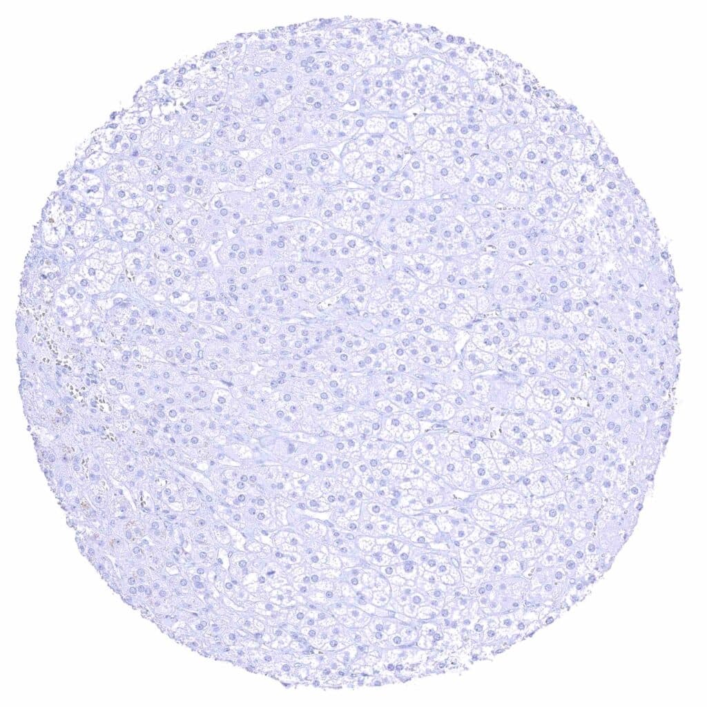Kidney, cortex – Distinct CD70 membranous staining of the parietal layer of the Bowman capsule and of the luminal surface membrane of few tubuli which appear atrophic.