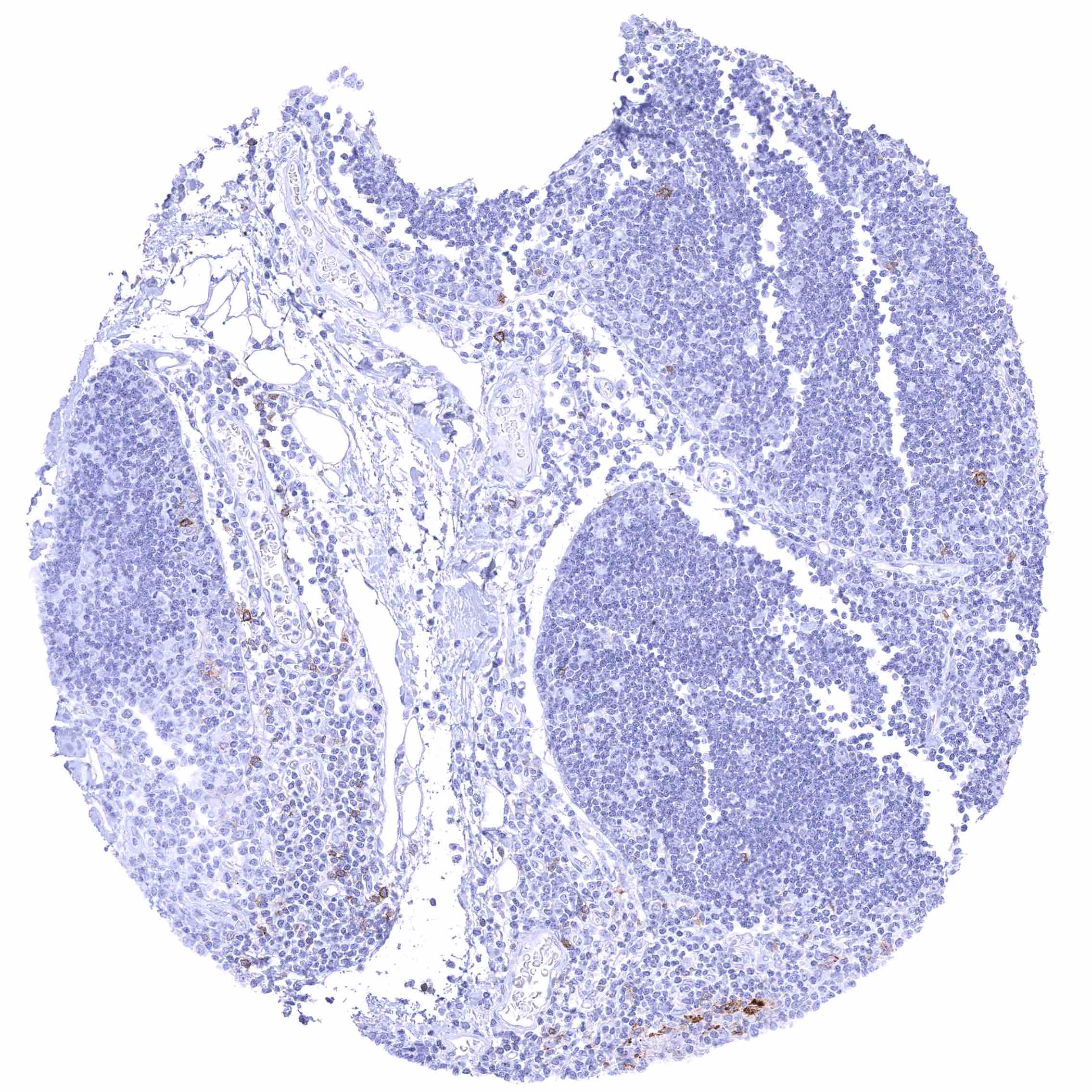 Lymph node – Membranous CD70 staining of variable intensity in subsets of cells (mostly lymphocytes). Most CD70 positive cells are interfollicular.