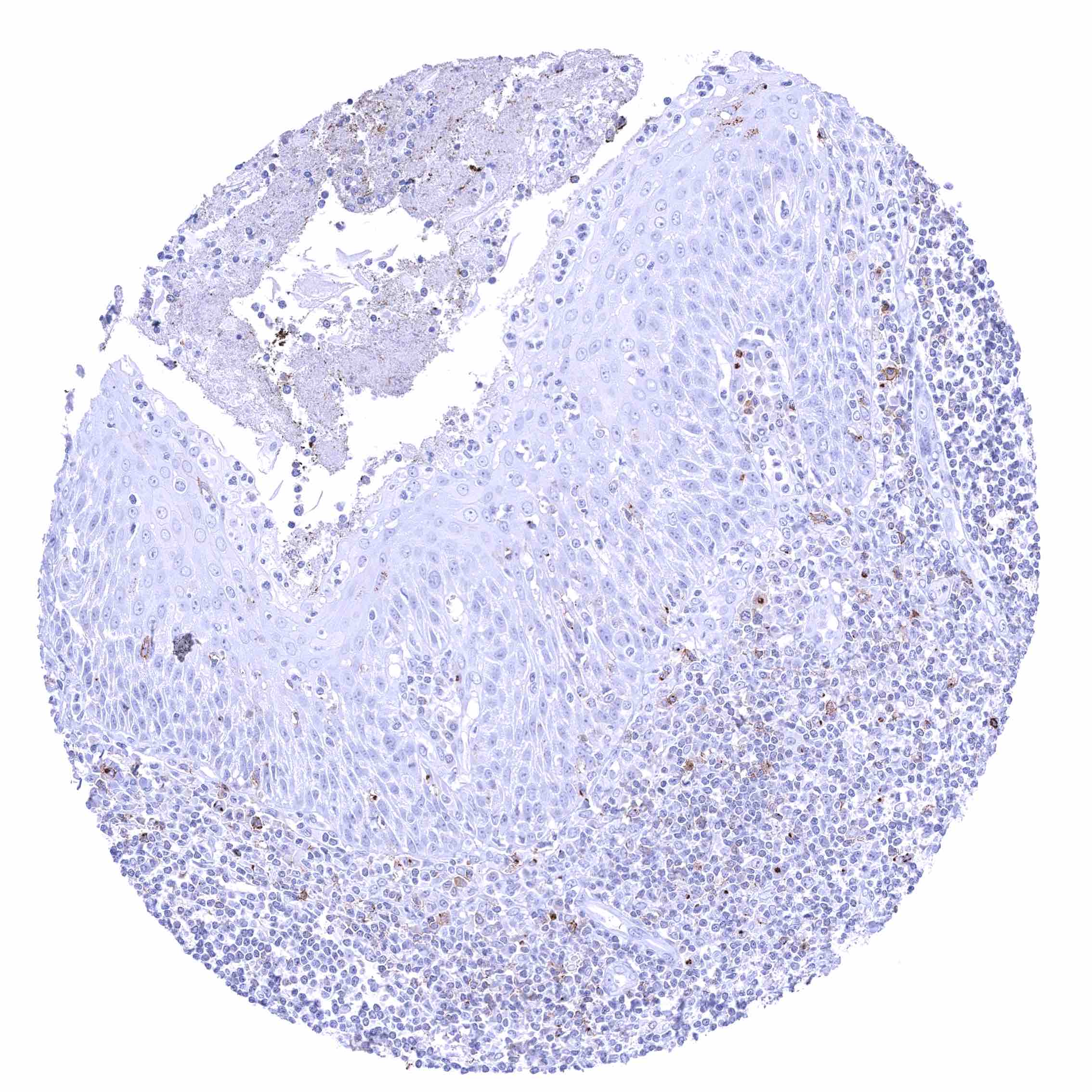 Tonsil, surface epithelium – Membranous CD70 staining of a subset of lymphocytes while squamous epithelium remains negative.