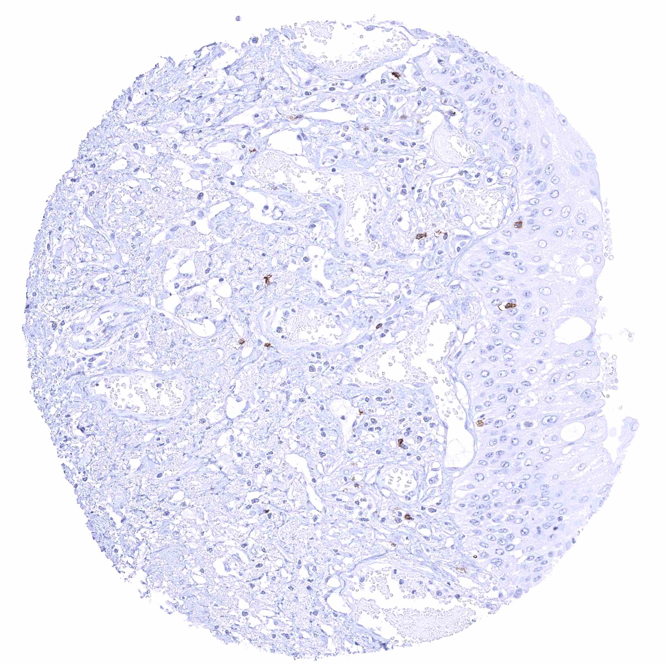Urinary bladder, urothelium – Membranous CD70 staining of intraepithelial lymphocytes.