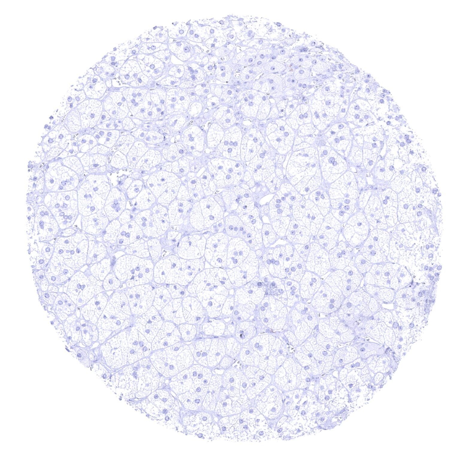 Adrenal gland - E-Cadherin staining is absent in adrenocortical cells.