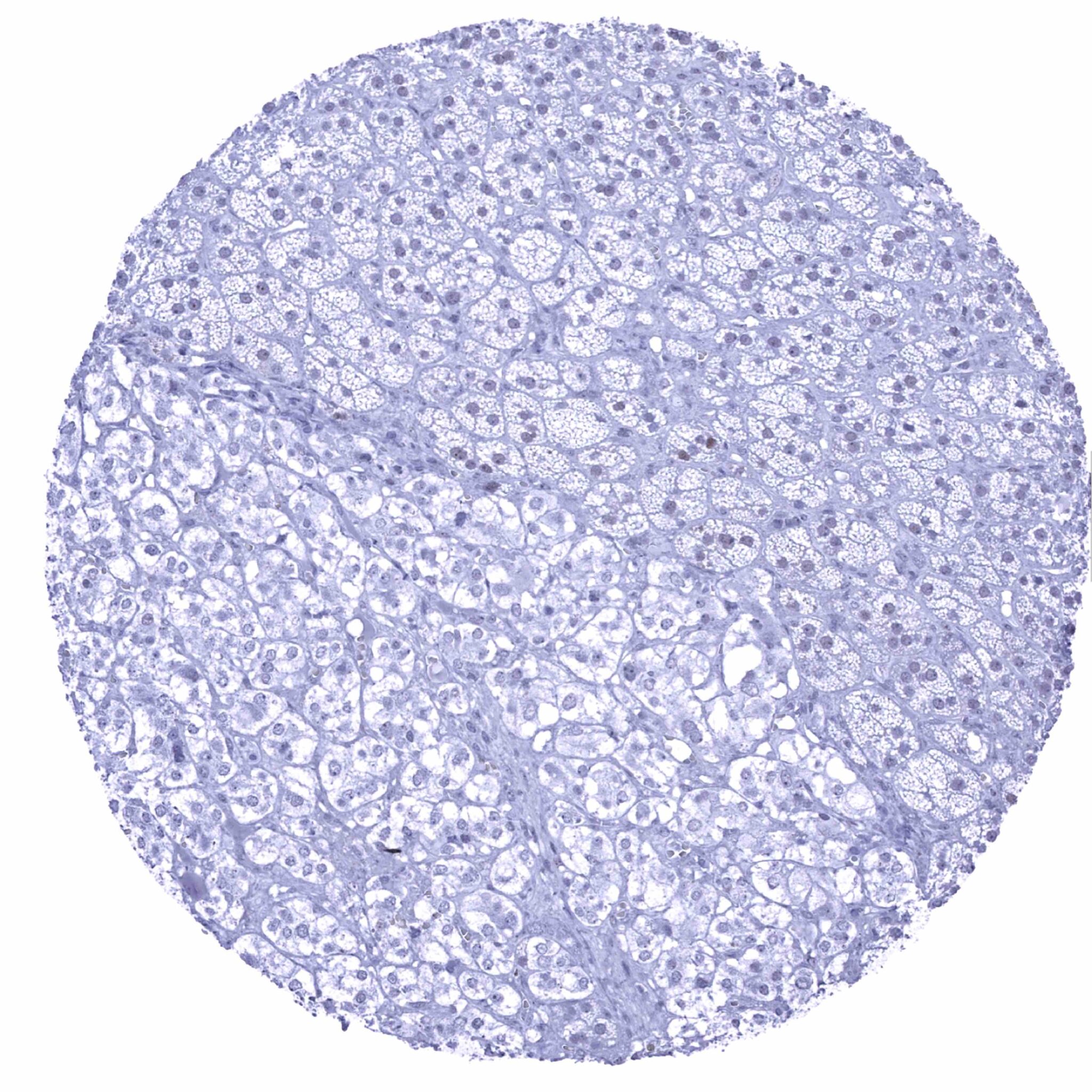 Kidney, cortex - Faint nuclear p53 staining of a small fraction of tubular cells (p53 immunohistochemistry).