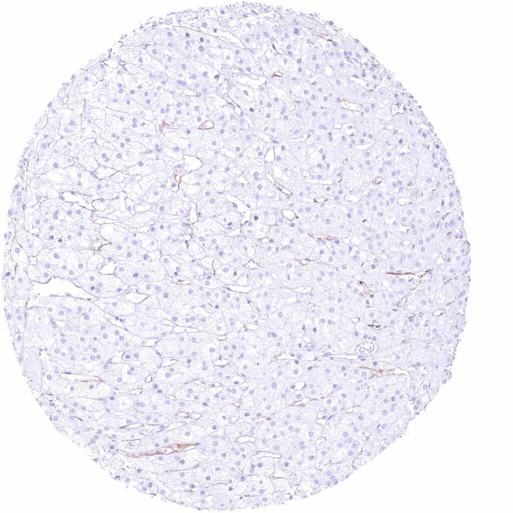 Kidney, cortex – Intense PODXL staining of glomerular endothelial cells while endothelial staining is less prominent on small intertubular vessels.