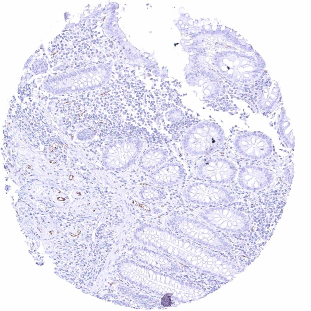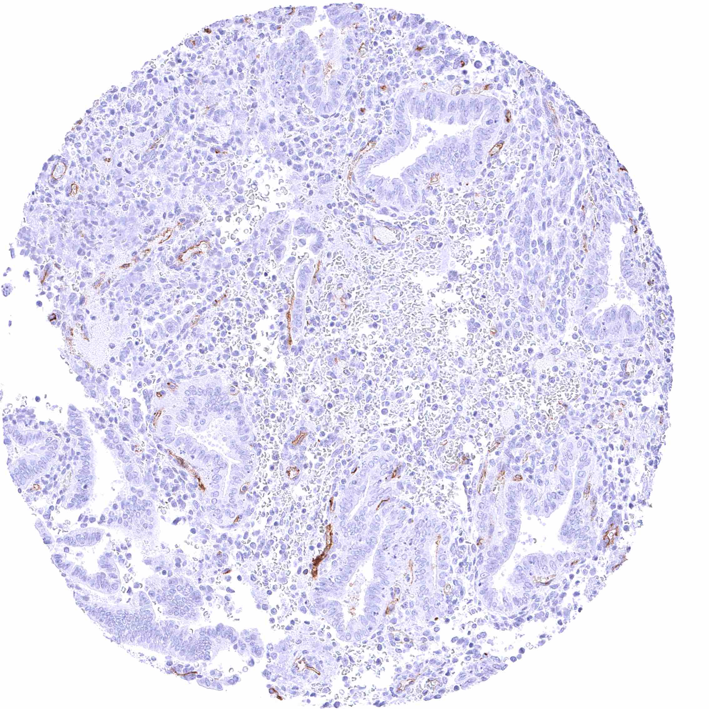 Uterus, endometrium (pregnancy) – Weak to moderate, membranous PODXL staining of few decidua cells.