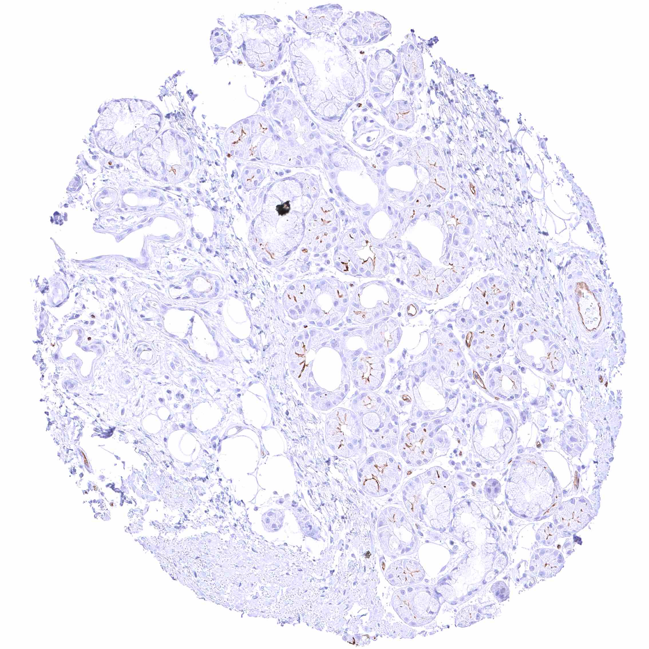 Breast – Moderate PODXL staining of apical membranes of a subset of luminal epithelial cells.