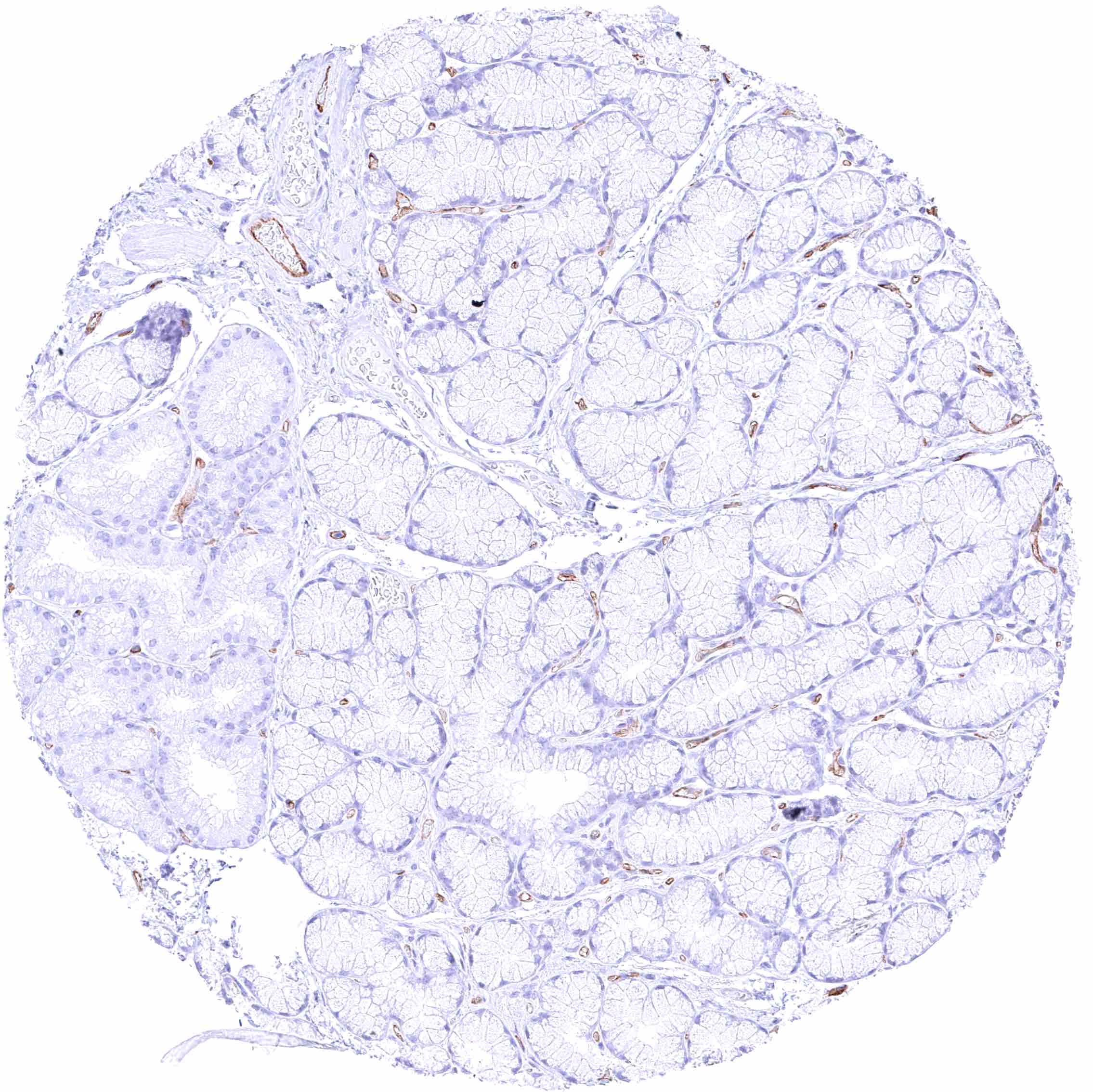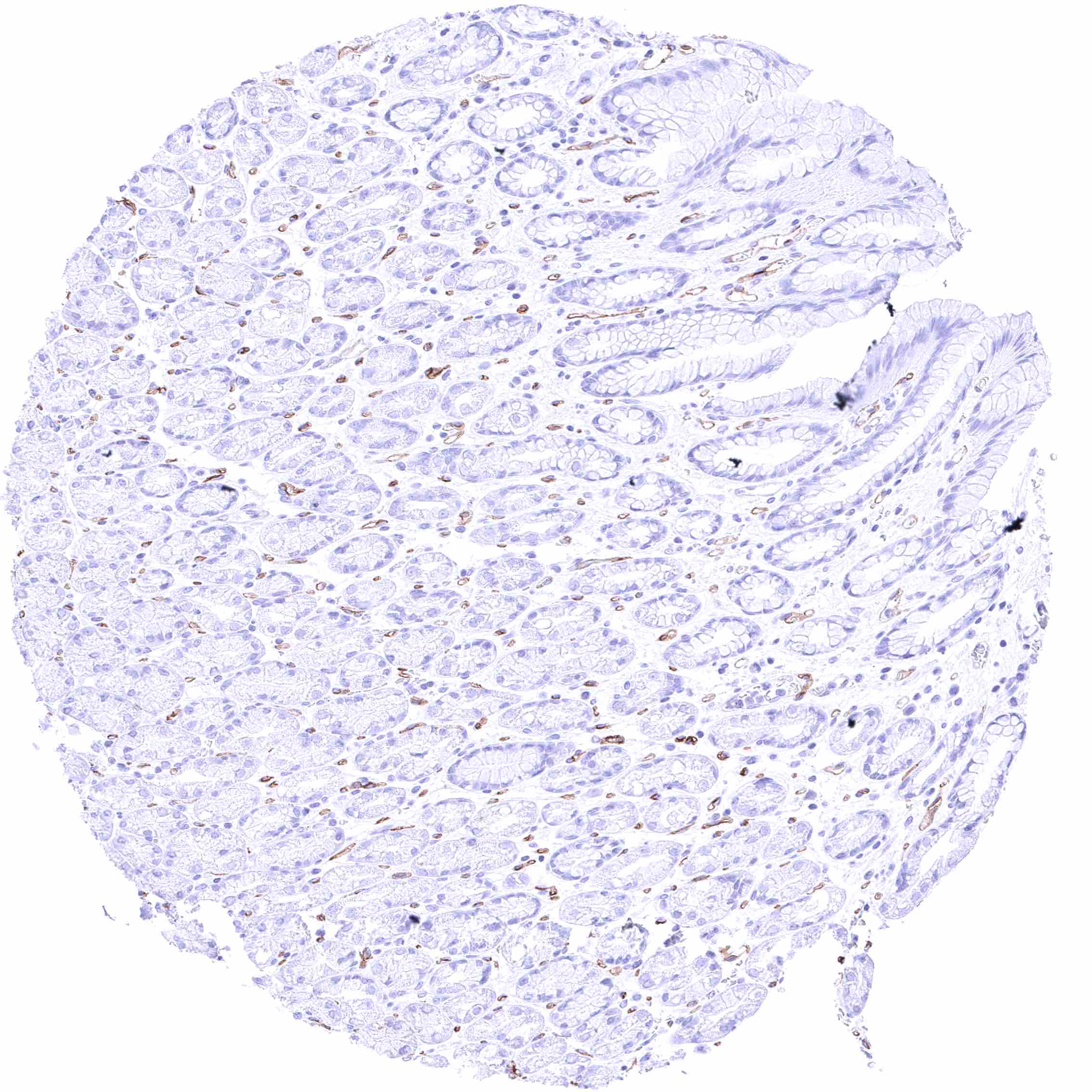 Stomach, antrum – PODXL of endothelial cells of small vessels.