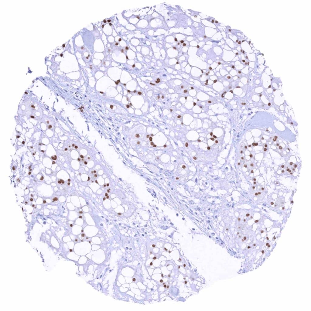 Negative control = Normal kidney: Brachyury staining must be completely absent in all cells (any other normal tissue could be used instead).