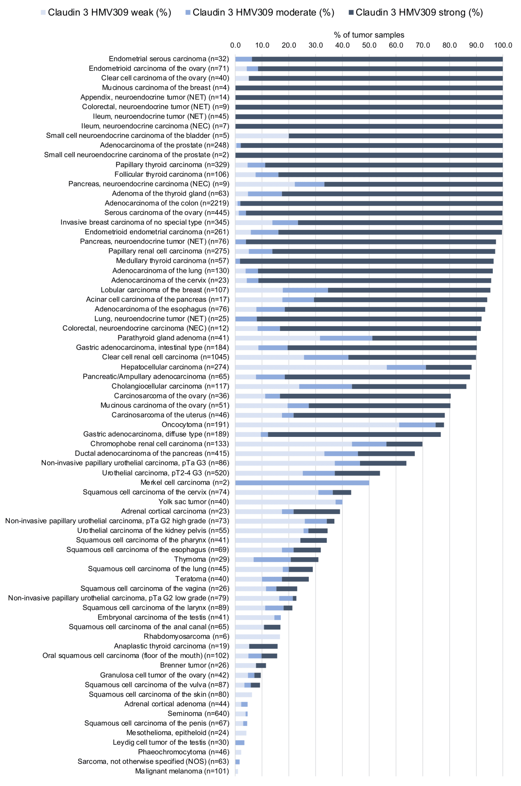 Overall, 96 of 133 tumor categories showed detectable Claudin 3 staining with 80 tumor categories showing at least one strongly positive case. The highest frequencies of Claudin-3 positivity were seen in adenocarcinomas (67–100%) and neuroendocrine neoplasms (92–100%) from different organs, as well as in several tumors of the female genital tract—including diverse subtypes of ovarian and endometrial carcinoma (up to 100%)—and in various subtypes of breast cancer (95.3–100%). The Claudin 3 positivity rates are shown in an “organ-systematic” (Figure 1) and in a “ranking order” figure (Figure 2) below (images based on data from Büyücek et al). Associations with clinical/pathological parameters are also summarized (Figure 3; based on data described by Büyücek et al).