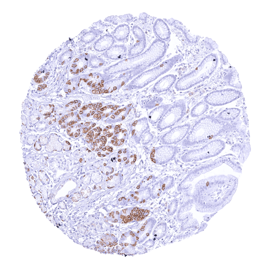 Negative control = Stomach: Most epithelial cells should be CLDN3 negative, while a strong membranous CLDN3 staining of a small subset of epithelial cells in the neck and in glandular pits must be seen.