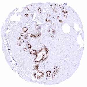 Female genital | Breast | Moderate to strong GATA3 positivity of most or all fraction of luminal cells while myoepithelial cells remain GATA3 negative. |