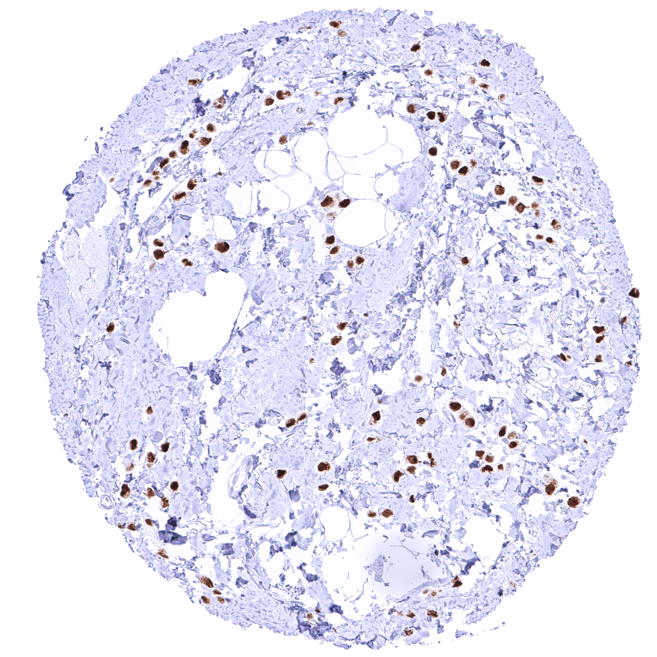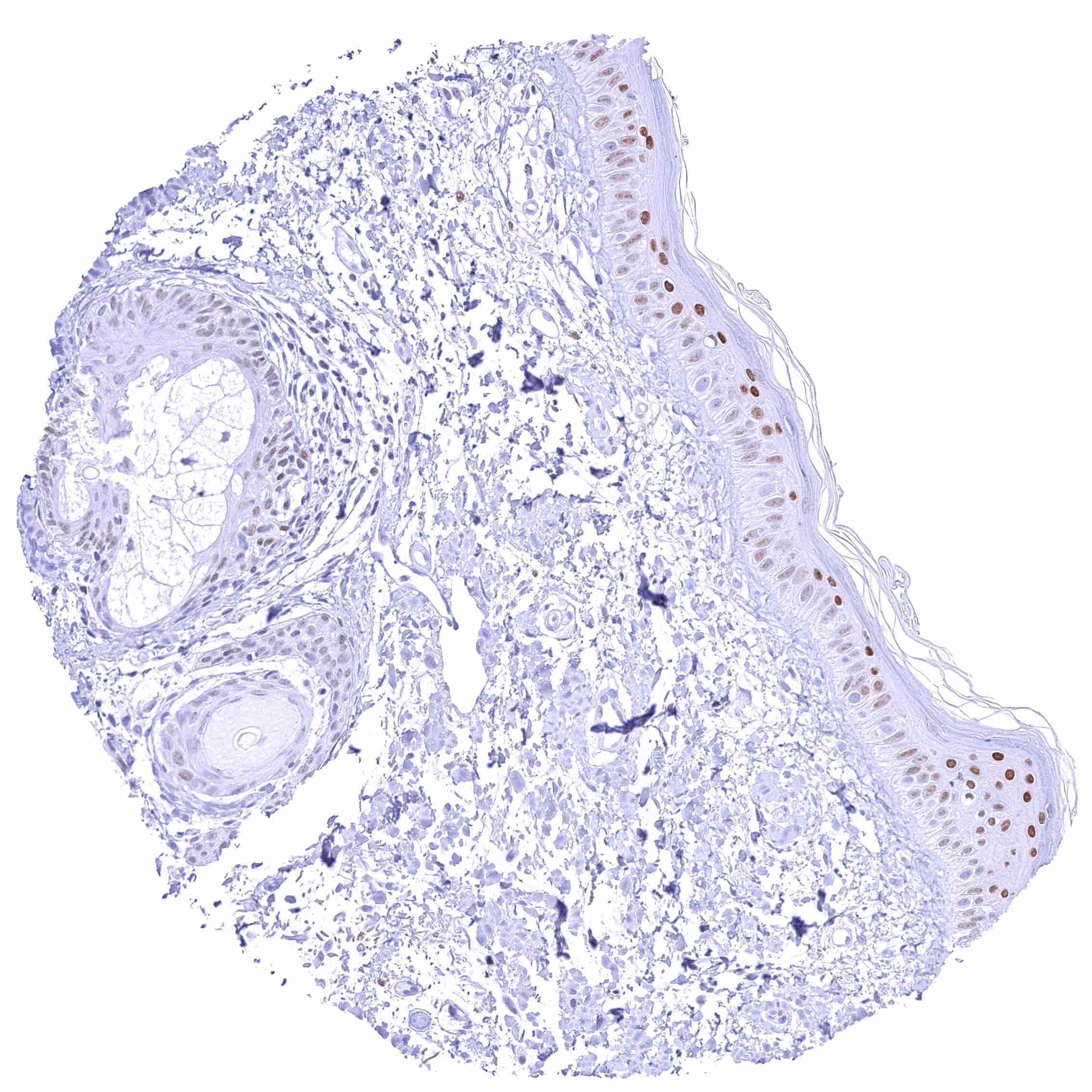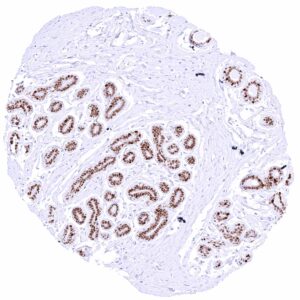 Sebaceous glands | Moderate to strong nuclear GATA3 positivity of peripheral germinative cells and of cells from including hair follicles. Sebaceous gland cells are only weakly positive or GAA3 negative. | |