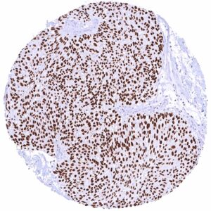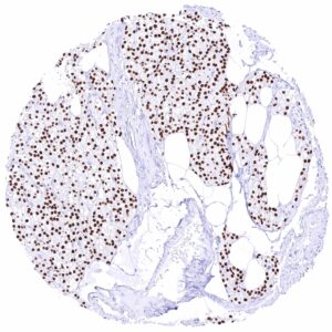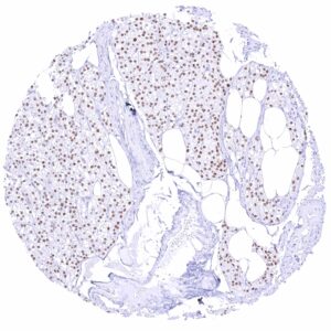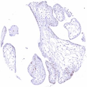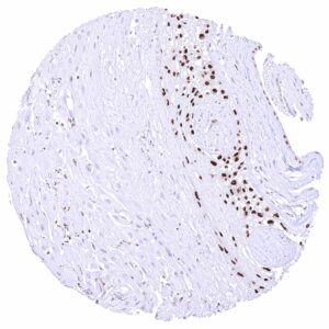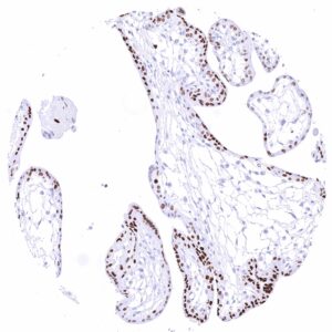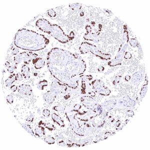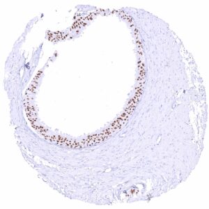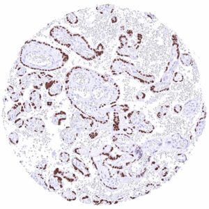 The GATA3 gene at 10p14 consists of 8 exons and codes for the GATA3 transcription factor which is critical for the embryonic development of various tissues including the parathyroid gland and the kidney. It plays a role in the luminal differentiation of breast epithelium, the development of the collecting system of the kidney and the urothelium, and in trophoblastic differentiation. In lymphoid cells, GATA3 regulates the expression of a wide range of biologically and clinically important genes. GATA3 is required for the formation of T helper (Th) cells, especially Th2 cells which are critical for the development of allergic and humoral immune responses. In normal tissues, nuclear GATA3 immunostaining is seen in various tissues and cell types. It is most intense in urothelium, squamous epithelium of the skin, parathyroid gland, trophoblastic cells and chorion cells of the placenta, collecting ducts and glomerular podocytes of the kidney, seminal vesicle epithelium, and a fraction of luminal cells GATA3 also plays a role in cancer biology. It is one of the most commonly mutated genes in breast cancer where it plays a role in estrogen and androgen receptor signaling. Among tumors, GATA3 expression is primarily seen in urothelial and breast cancers but it can also occur in other tumor entities. The antibody MSVA-550R is markedly more sensitive than MSVA-450M for detection of nuclear GATA3 but causes some non-specific cytoplasmic staining in several tissues due to cross-reactivity.