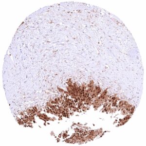 | Uterus, ectocervix | Cytoplasmic and nuclear GSTP1 positivity of variable intensity of squamous epithelial cells. Staining intensity is highest in the basal and suprabasal cell layers and decreases towards the surface. | |
