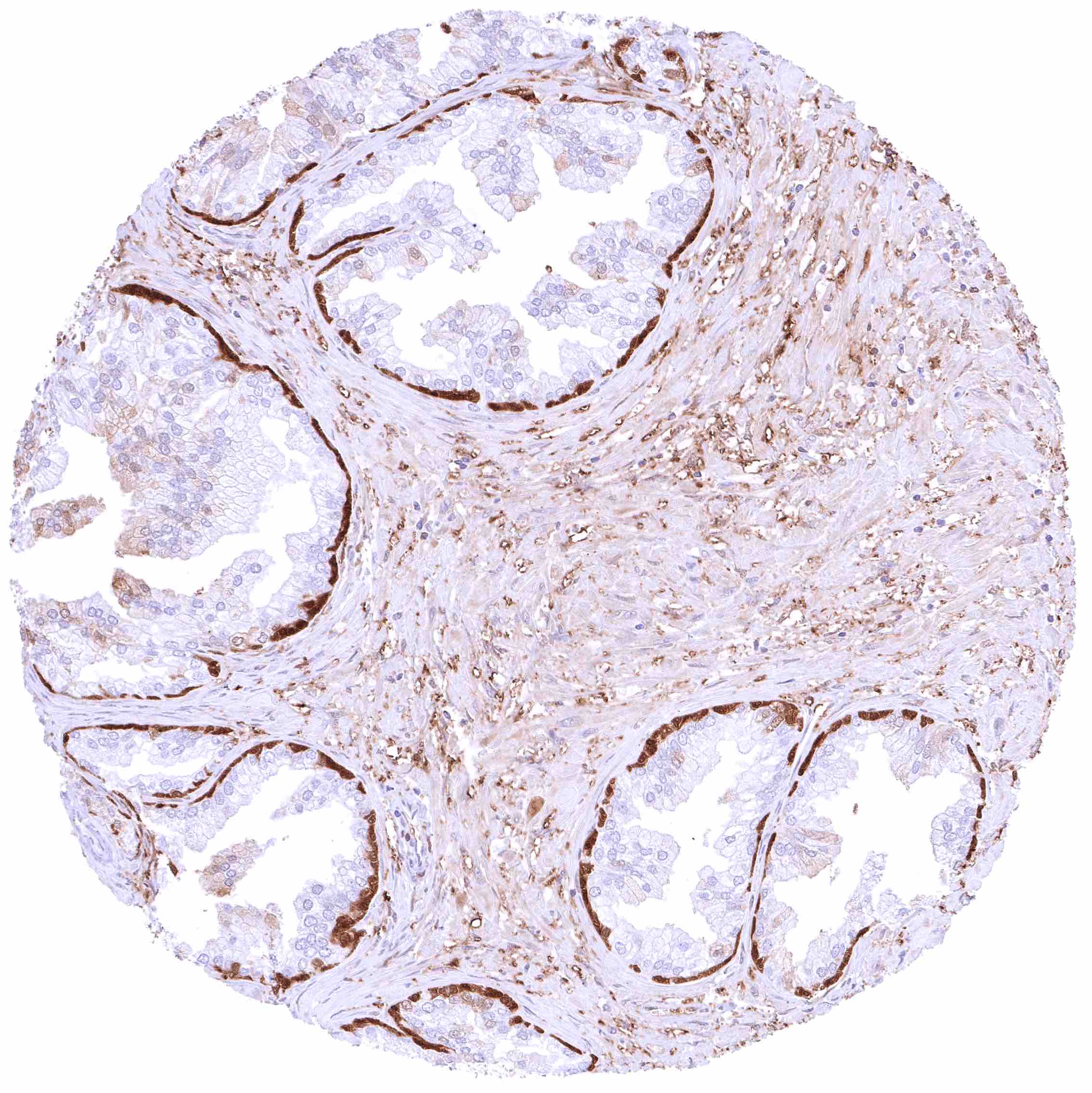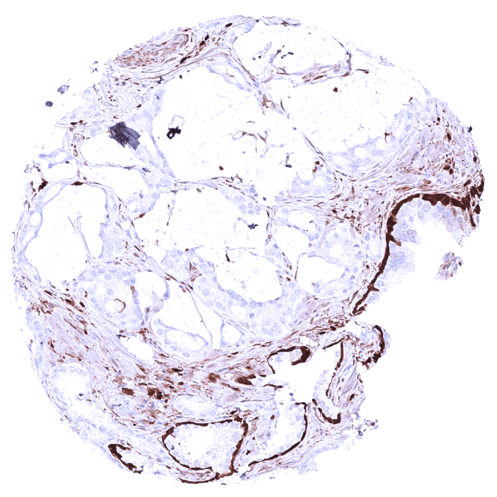 | Male genital | Prostate | Intense nuclear and cytoplasmic GSTP1 staining of basal cells while staining is faint, weak or absent in acinar cells. |