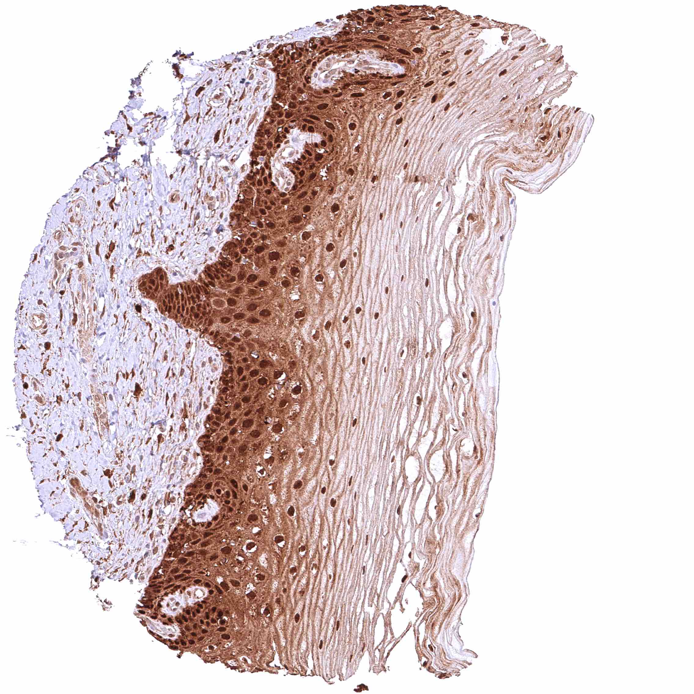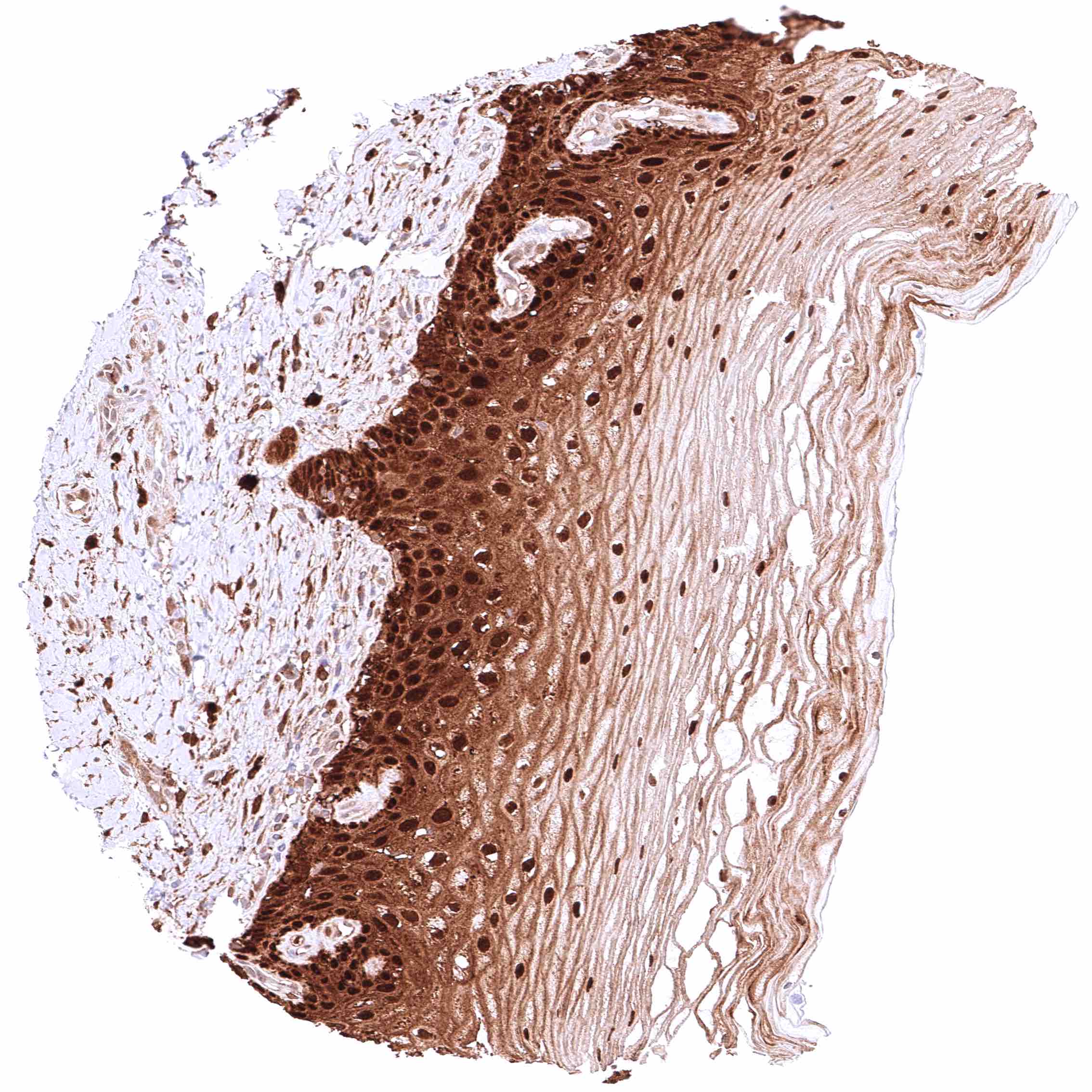 | Esophagus | Strong cytoplasmic and nuclear GSTP1 positivity of squamous epithelial cells. Staining intensity is highest in the basal and suprabasal cell layers and decreases slightly towards the surface. | |