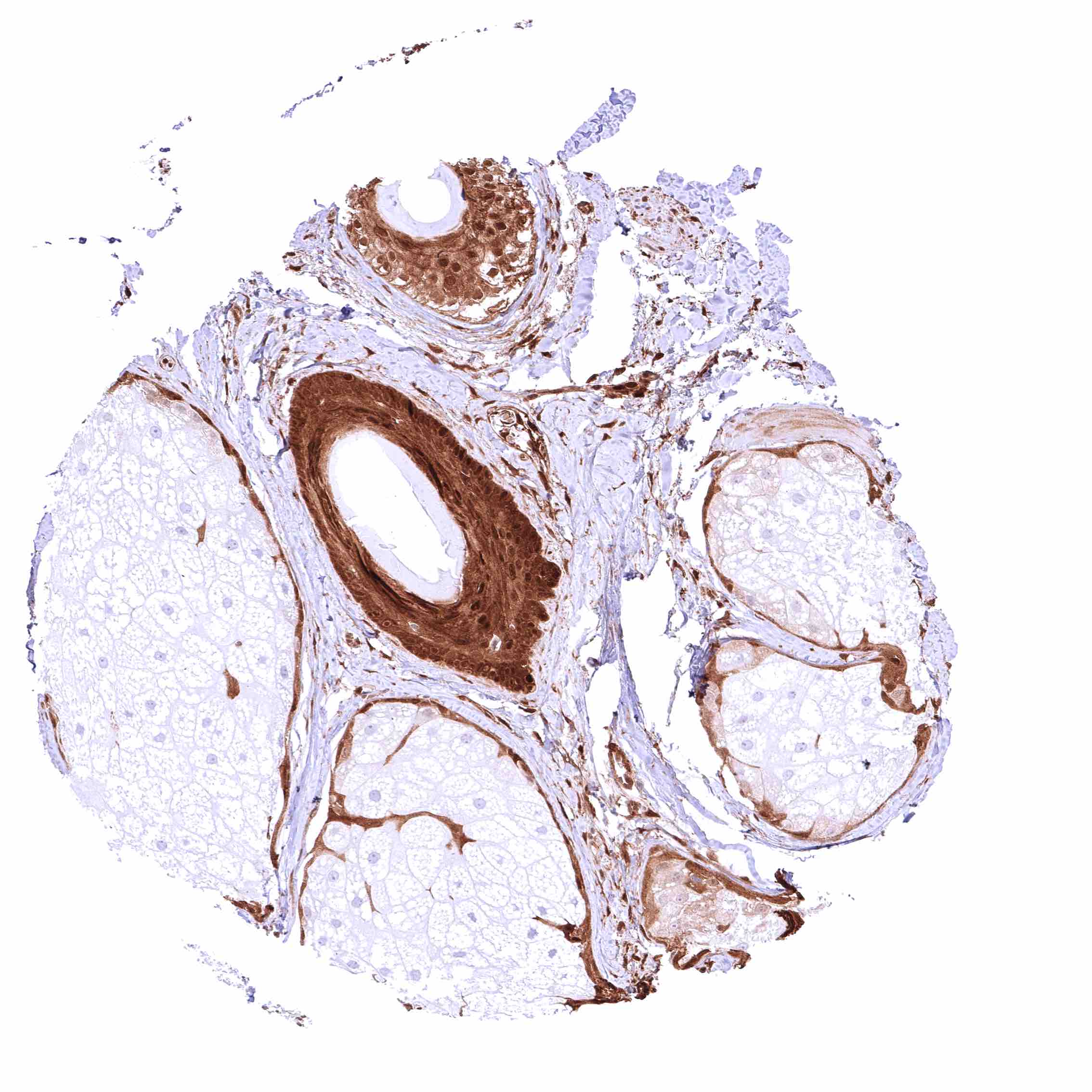 | Sebaceous glands | Strong GSTP1 positivity of hair follicles, eccrine glands and peripheral germinative cells of sebaceous glands while sebaceous cells remain GSTP1 negative. | |