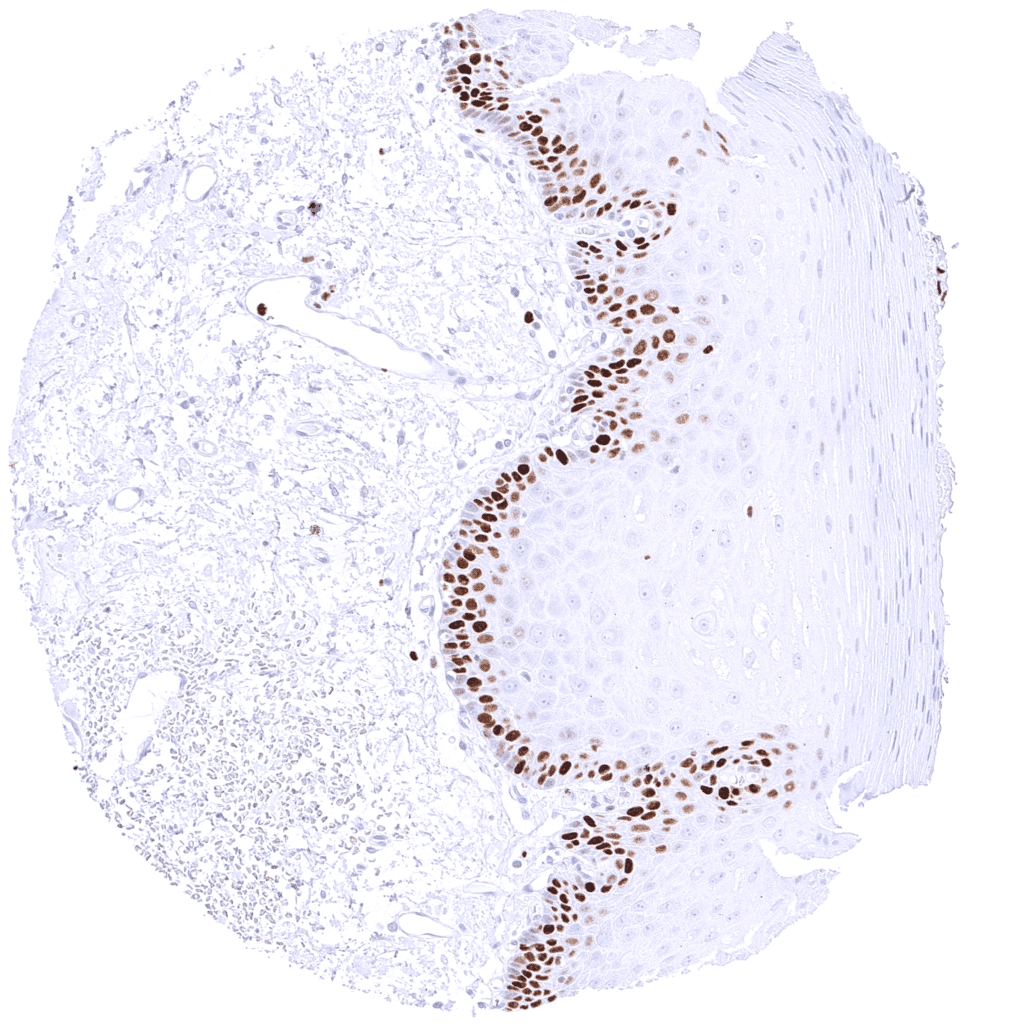 | Skin | Epidermis | Suprabasal and basal cells of the squamous epithelium show a distinct nuclear MCM5 positivity. |