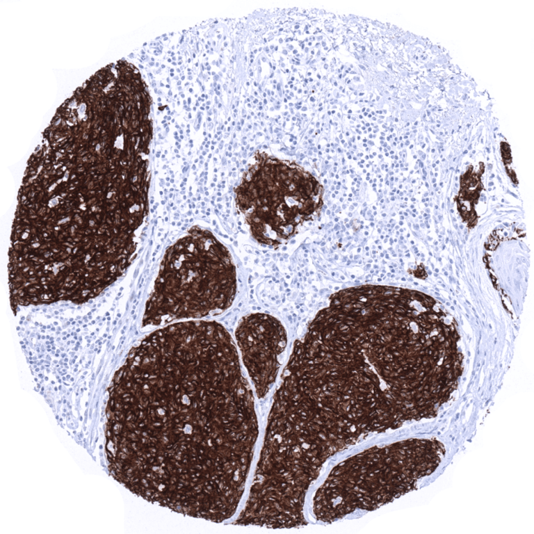 These images reflect stainings by the protocol described above. It is of note that a comparable staining result can also be obtained by different protocols. In general, a longer pretreatment, a longer incubation time of the primary antibody, a higher antibody concentration, and a longer incubation time of FLEX+LINKER result in stronger staining, potentially at the cost of more background staining. Modifications of the protocol with a strengthening effect on staining intensity in combination with changes of other parameters that result in lower staining intensity can result in a comparable result as shown above.