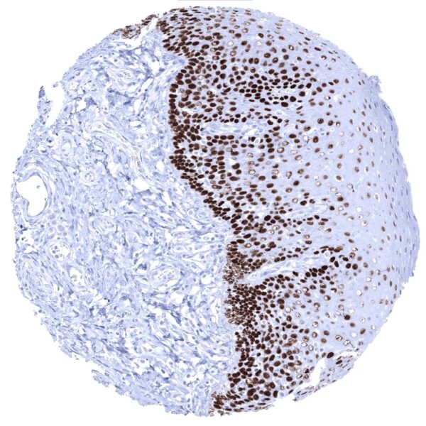 Positive control = Tonsil: Virtually all squamous epithelial cells must show a moderate to strong, nuclear staining, while few scattered lymphocytes and endothelial cells must show a at least a weak staining.