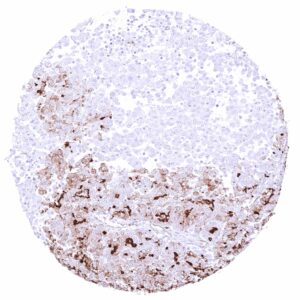 Positive control = Kidney: A strong PODXL must be seen in glomerular podocytes while at least a weak to moderate PODXL staining must be seen in endothelial cells of small intertubular vessels.