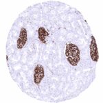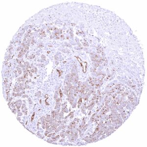 Freshly cut sections should be used (less than 10 days between cutting and staining). Heat-induced antigen retrieval for 5 minutes in an autoclave at 121°C in pH 7,8 Target Retrieval Solution buffer. Apply MSVA-645M at a dilution of 1:150 at 37°C for 60 minutes. Visualization of bound antibody by the EnVision Kit (Dako, Agilent) according to the manufacturer’s directions.