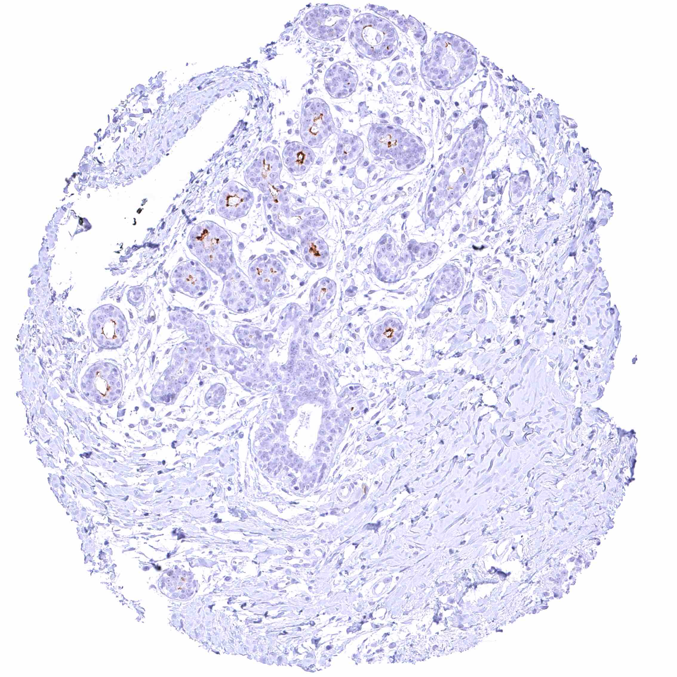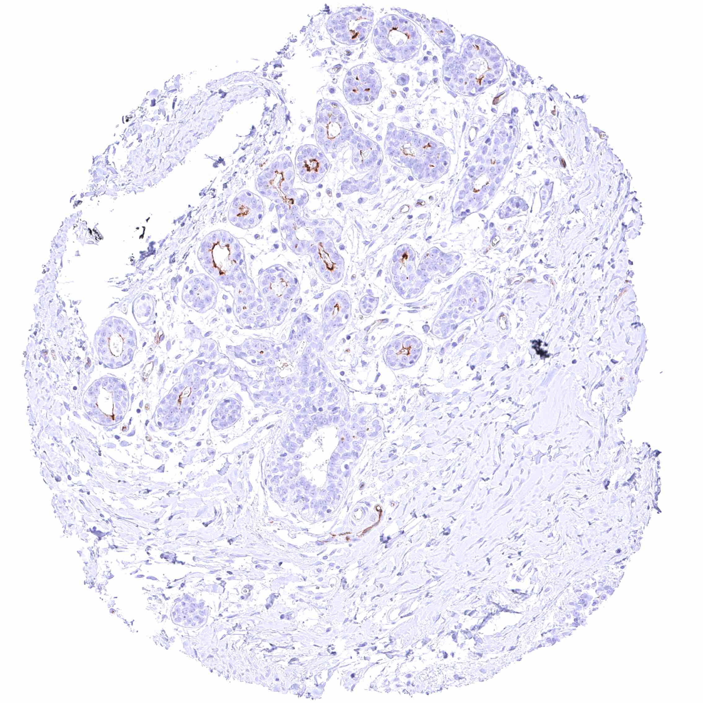 | Female genital | Breast | Moderate PODXL staining of apical membranes of luminal epithelial cells. |