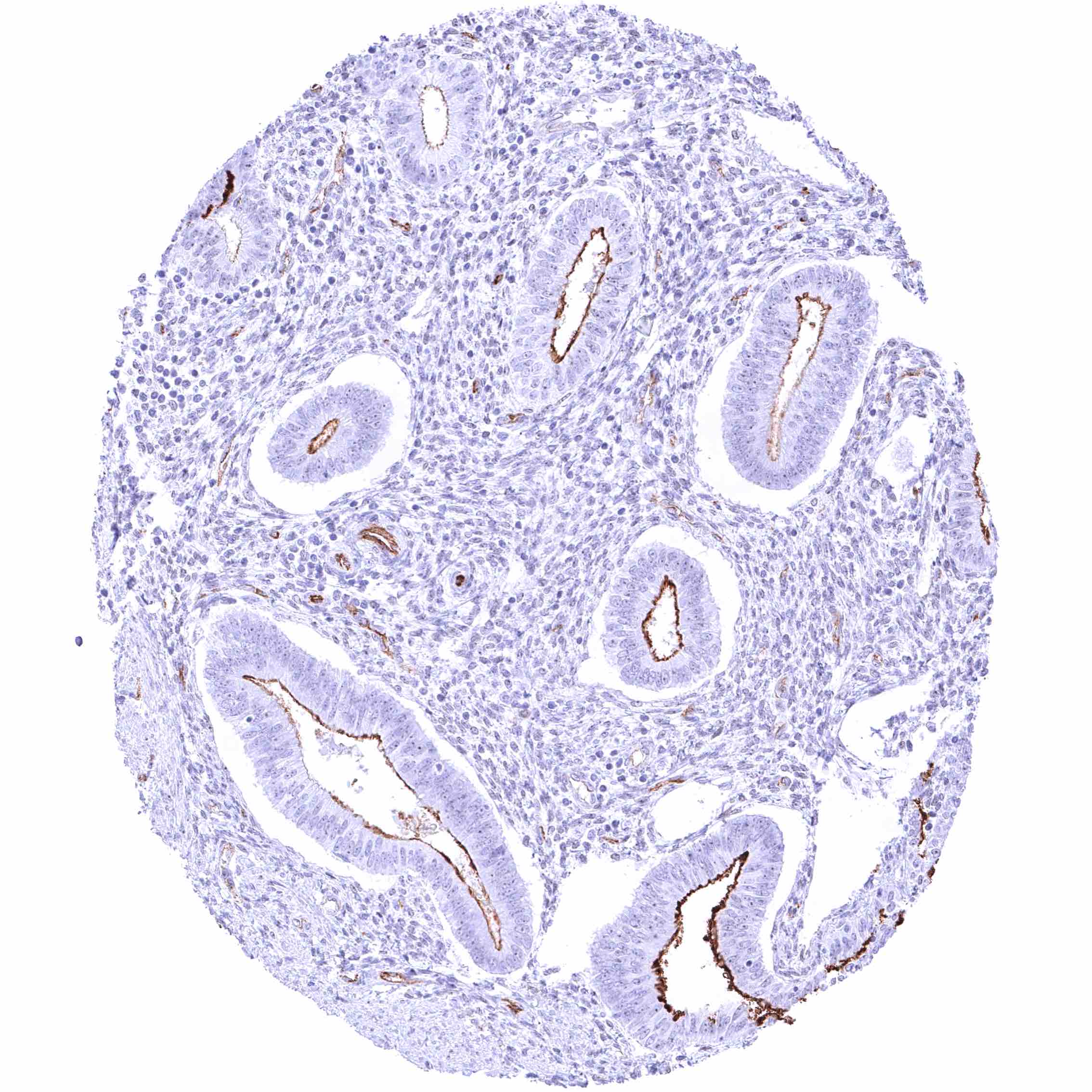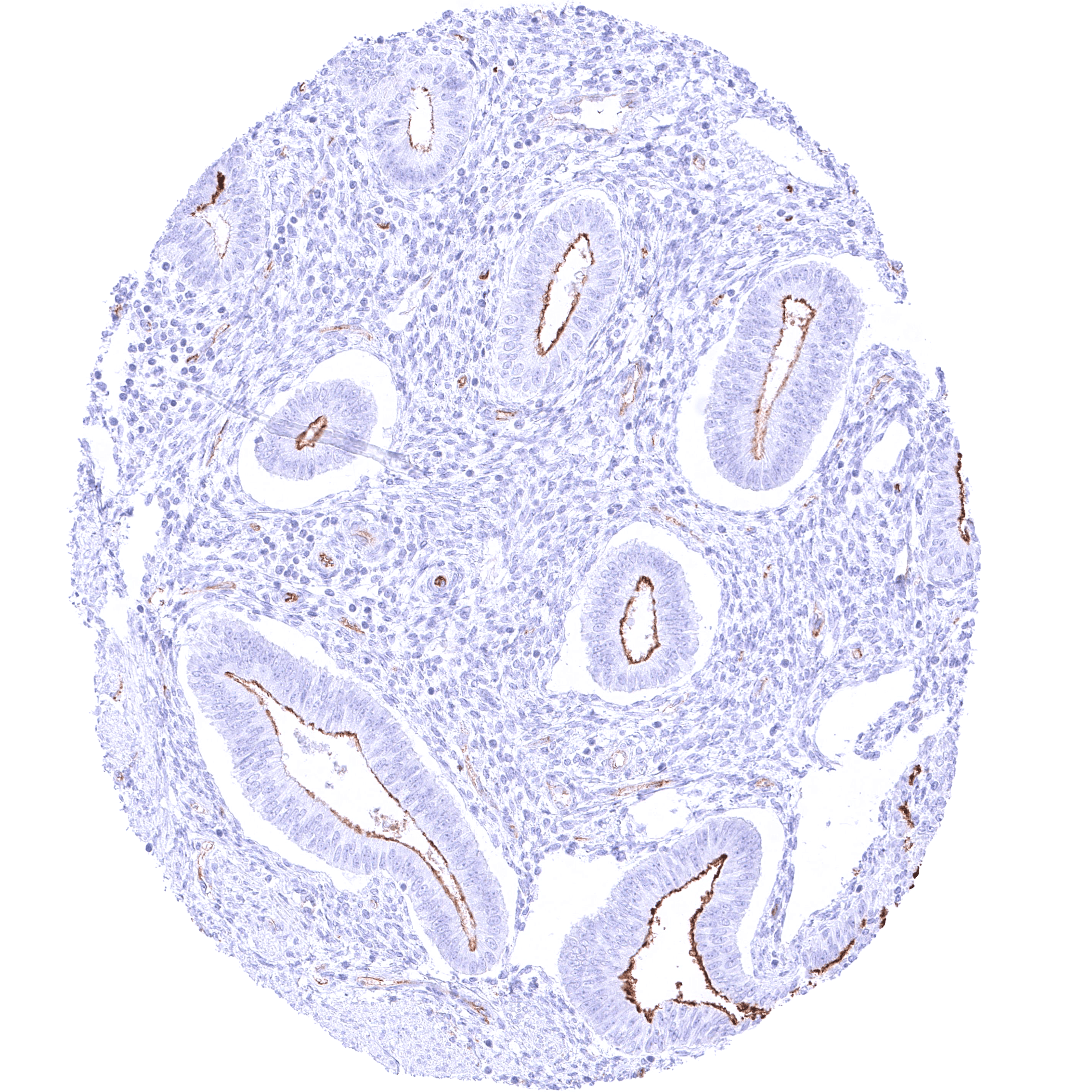 | Uterus, endometrium | Moderate PODXL staining of apical membranes of resting or proliferating endometrium glands while this may not be visible in secreting endometrium or during pregnancy. During pregnancy, a weak to moderate membranous staining of few decidua cells can occur. | |