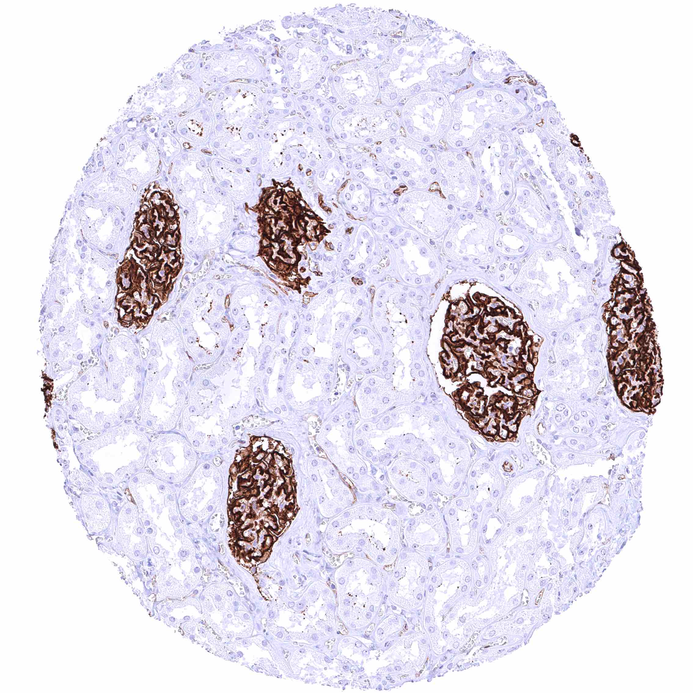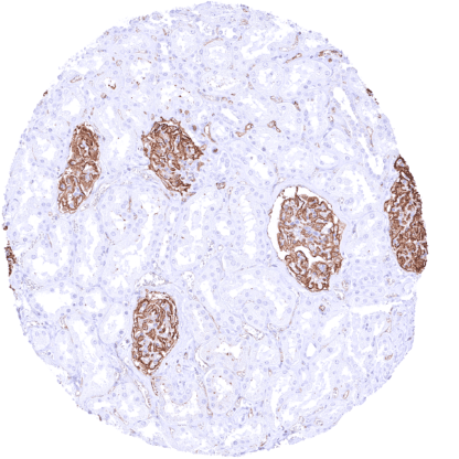 Positive control = Kidney: A strong PODXL must be seen in glomerular podocytes while at least a weak to moderate PODXL staining must be seen in endothelial cells of small intertubular vessels.